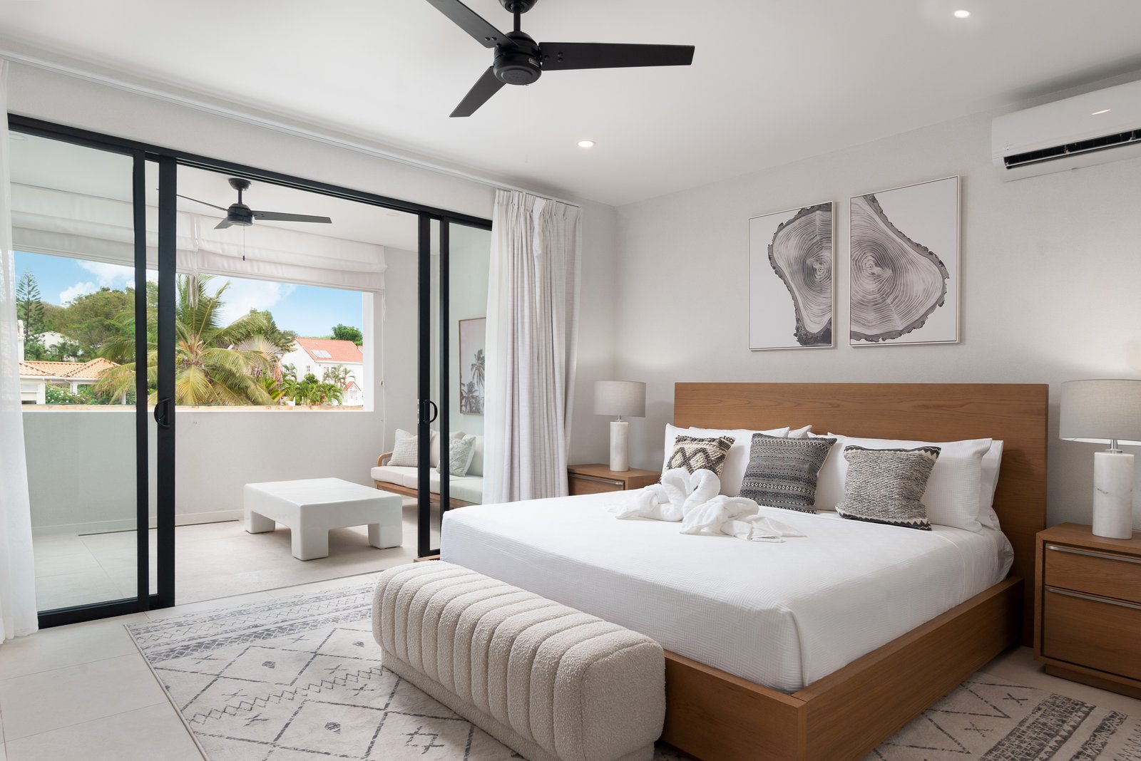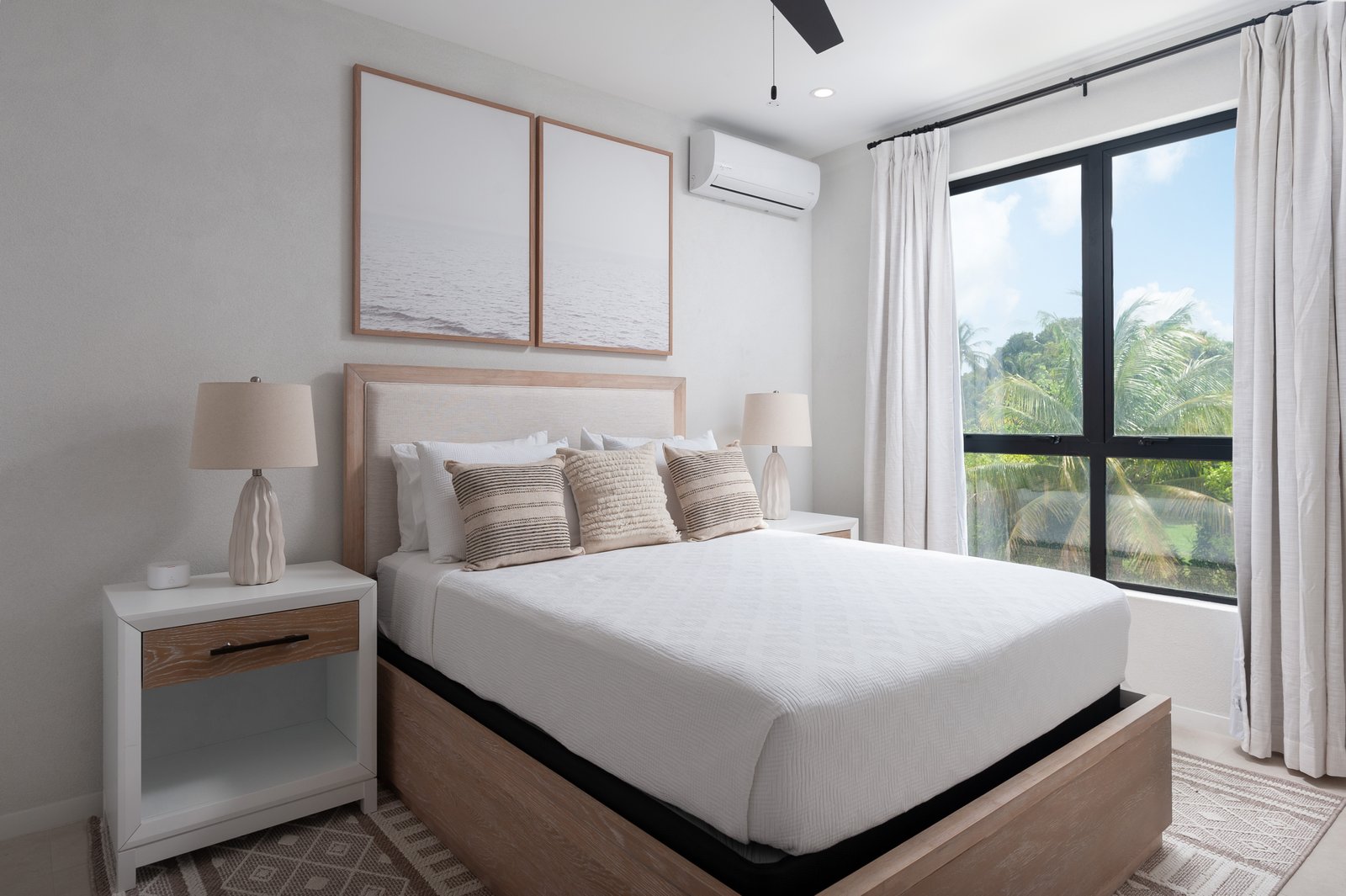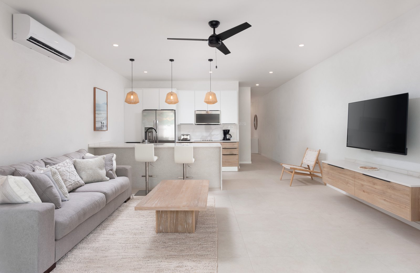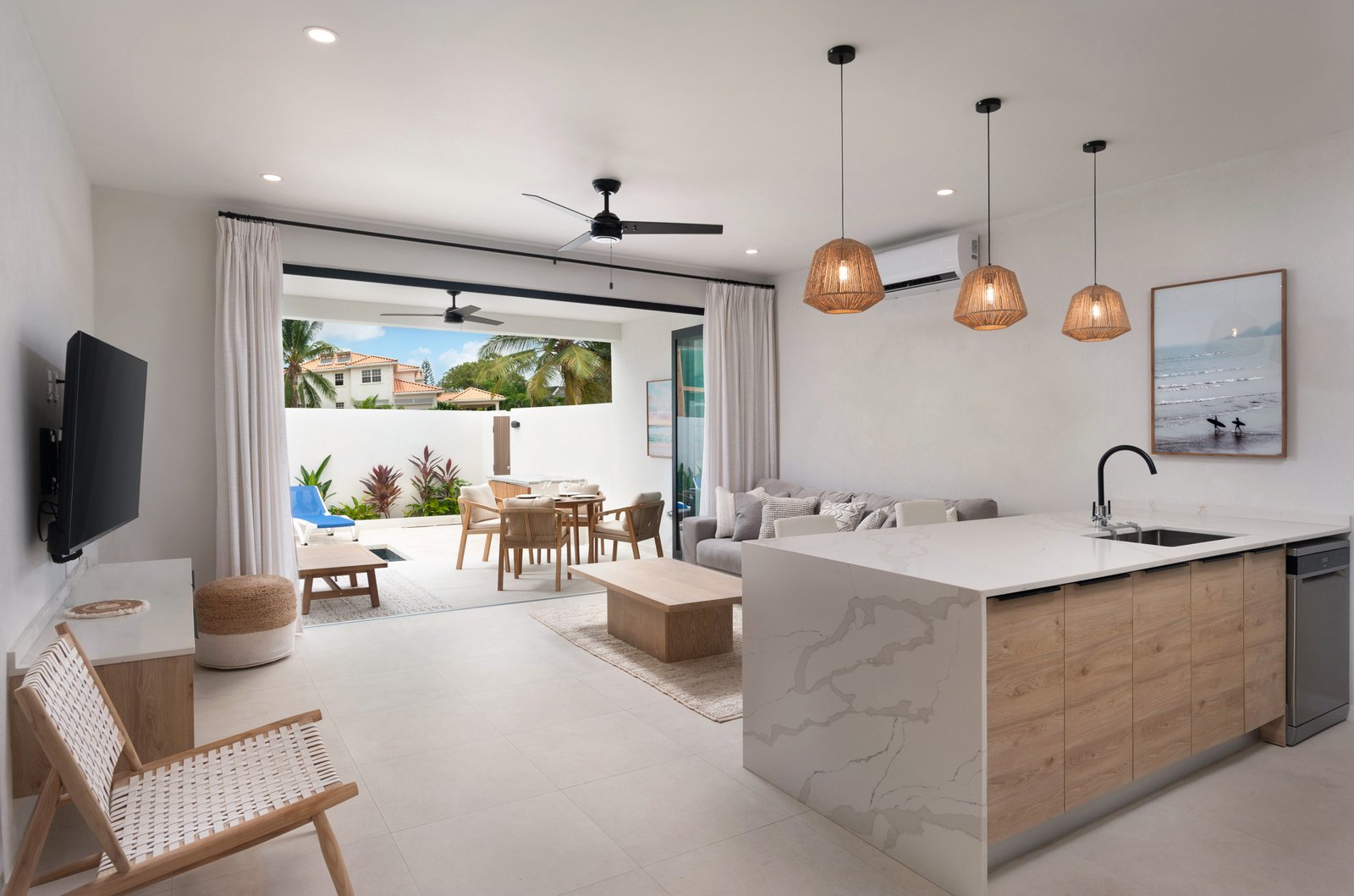 The sleek European-style kitchen features quartz countertops and high-quality appliances, combining style with practicality. Porcelain tile flooring throughout, along with ceiling fans and air conditioning in all bedrooms, ensures year-round comfort.