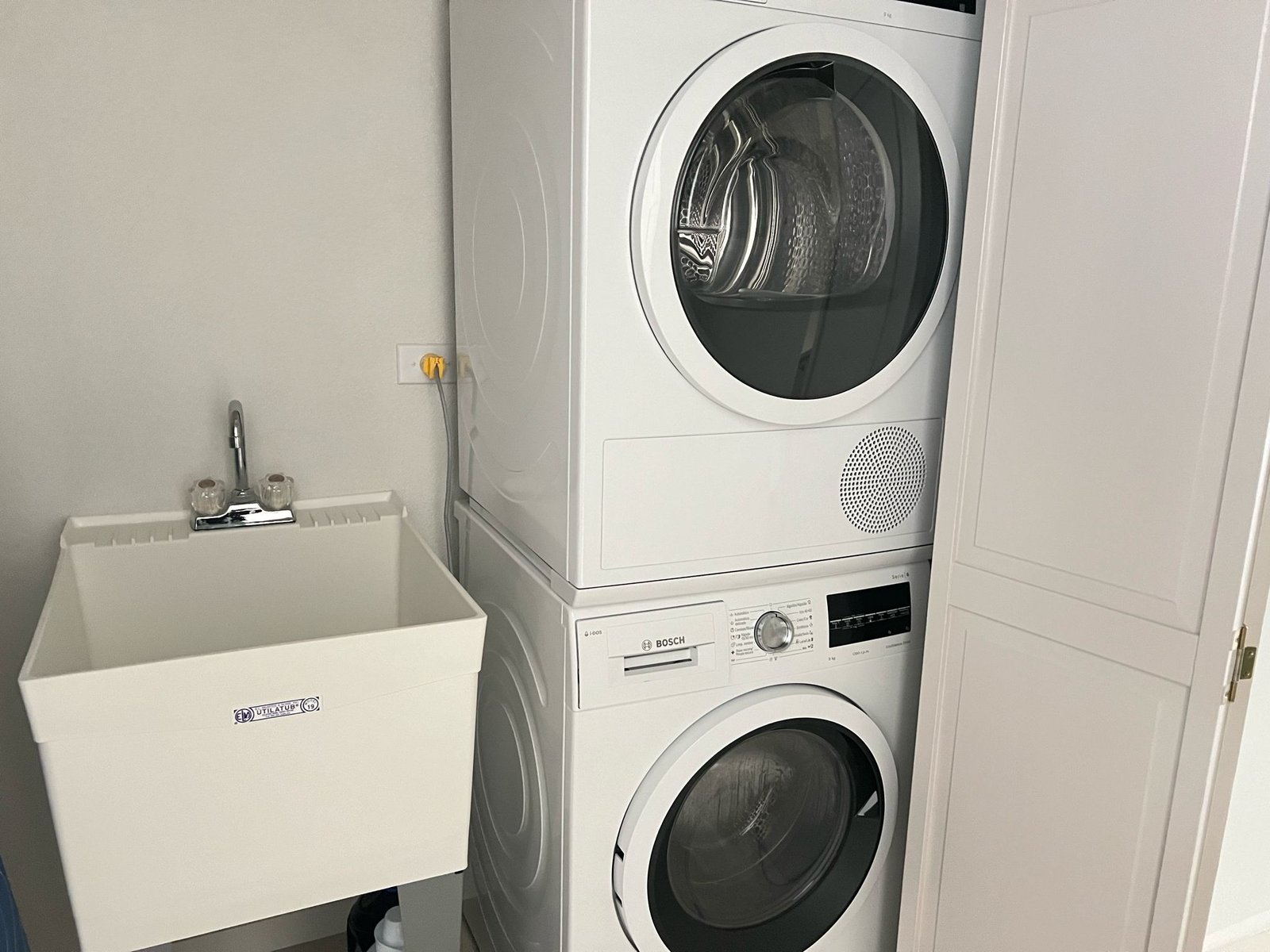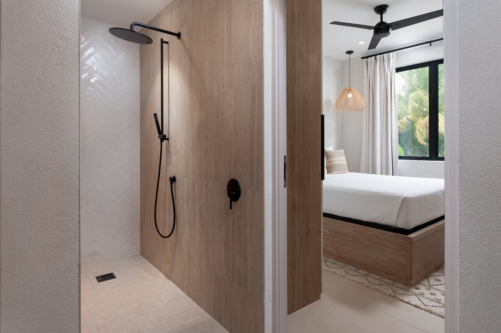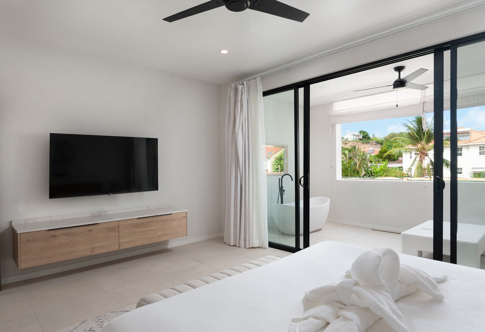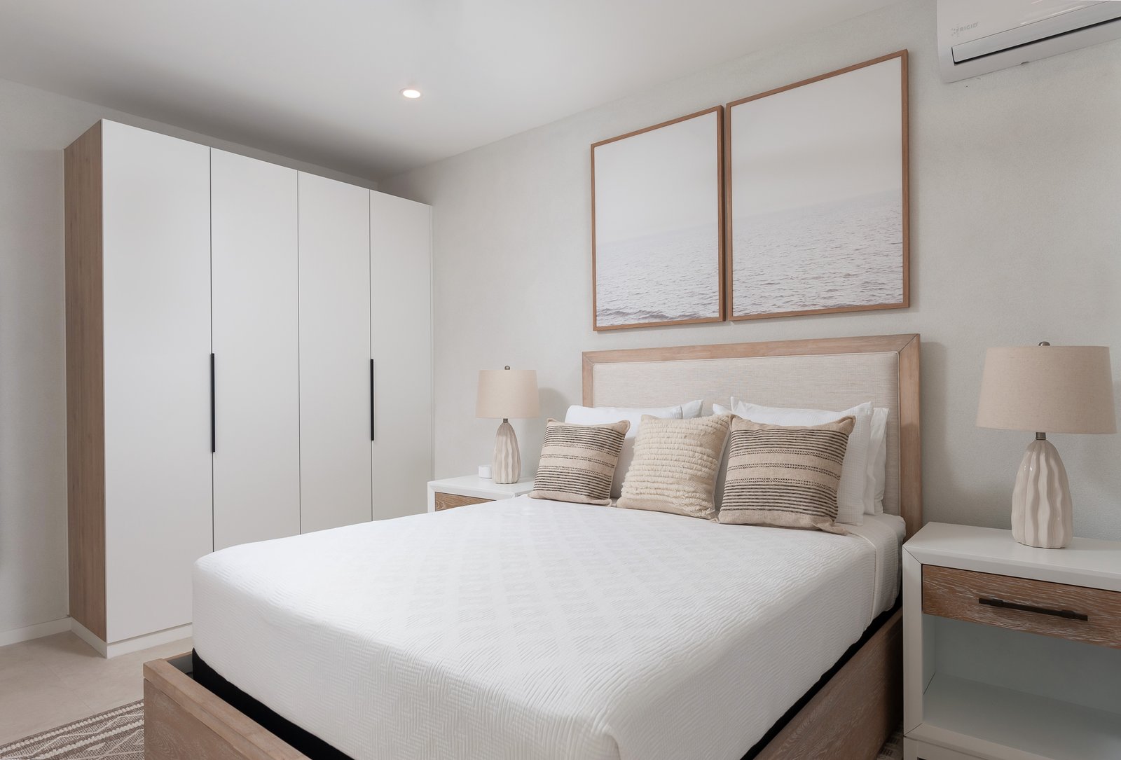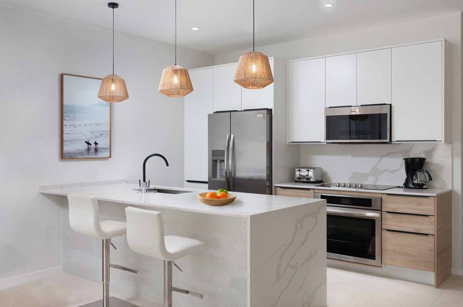 The sleek European-style kitchen features quartz countertops and high-quality appliances, combining style with practicality. Porcelain tile flooring throughout, along with ceiling fans and air conditioning in all bedrooms, ensures year-round comfort.