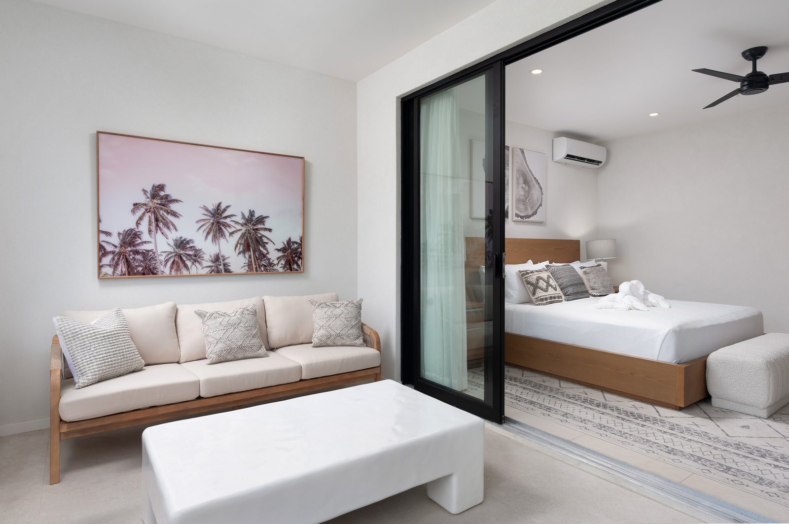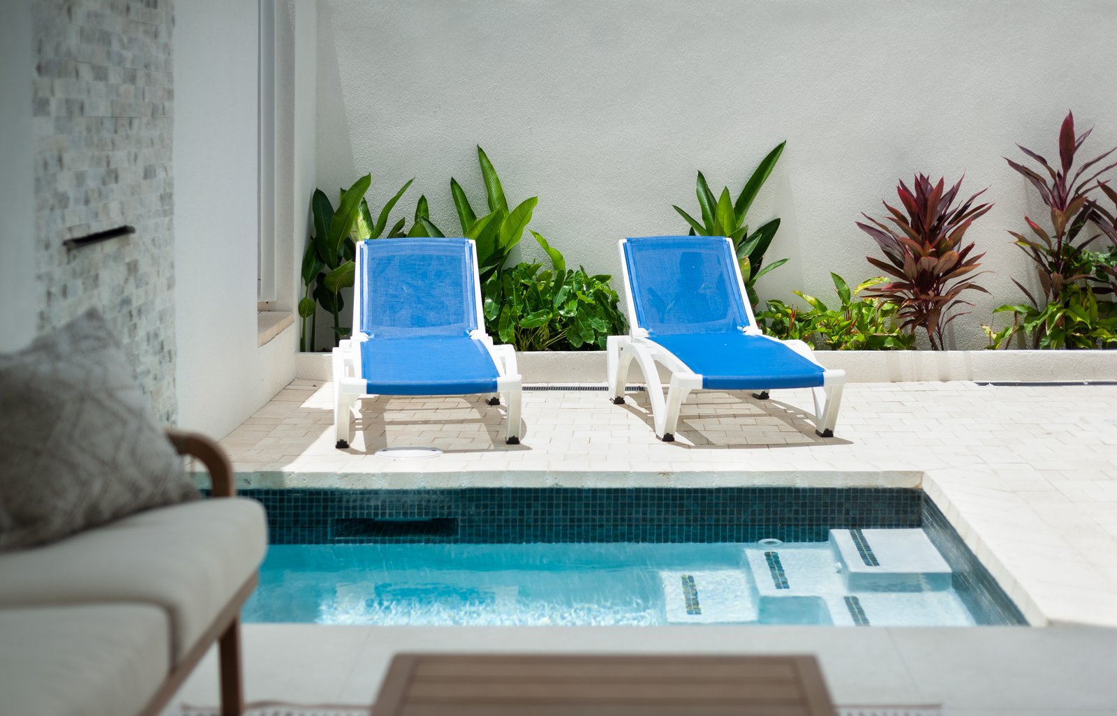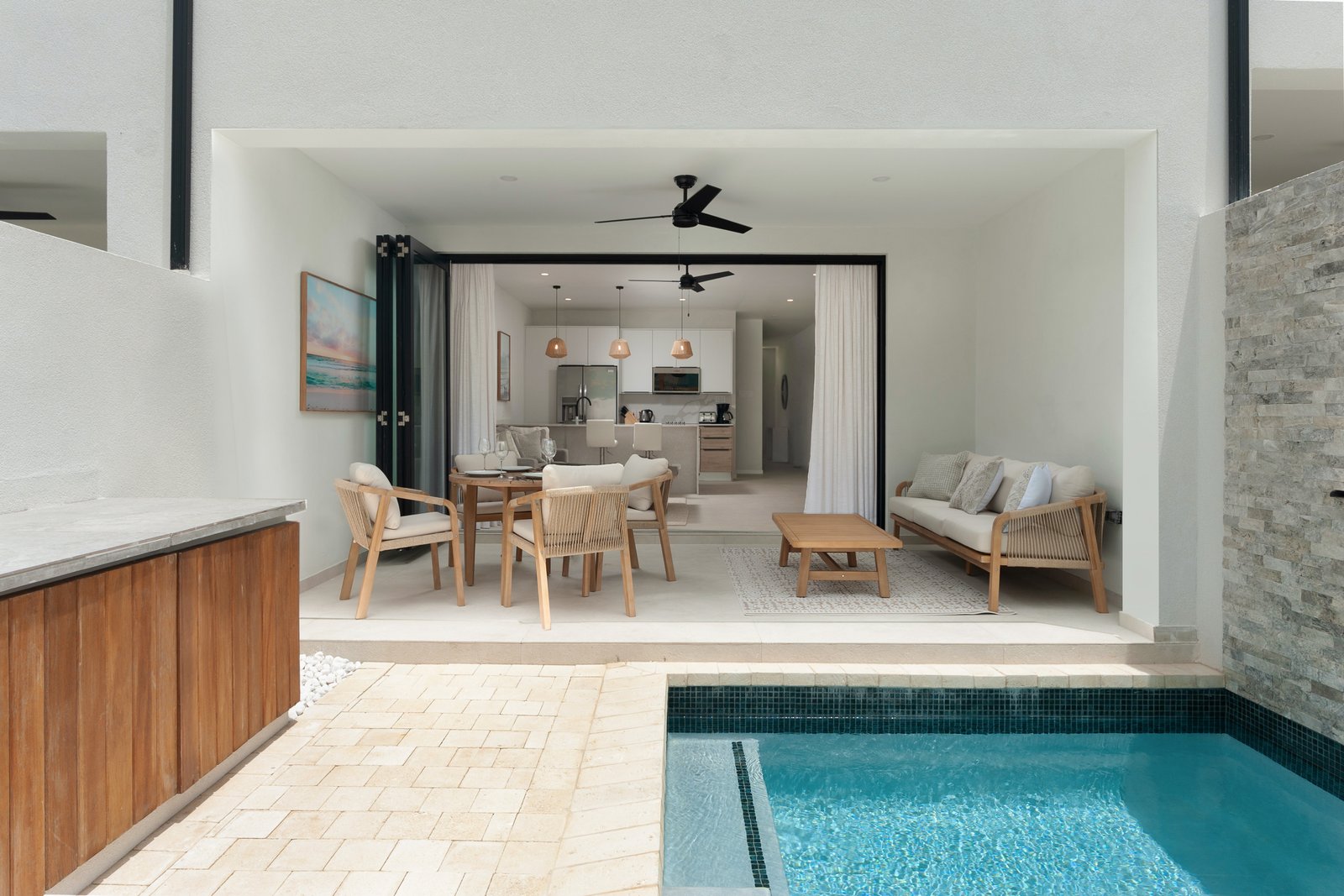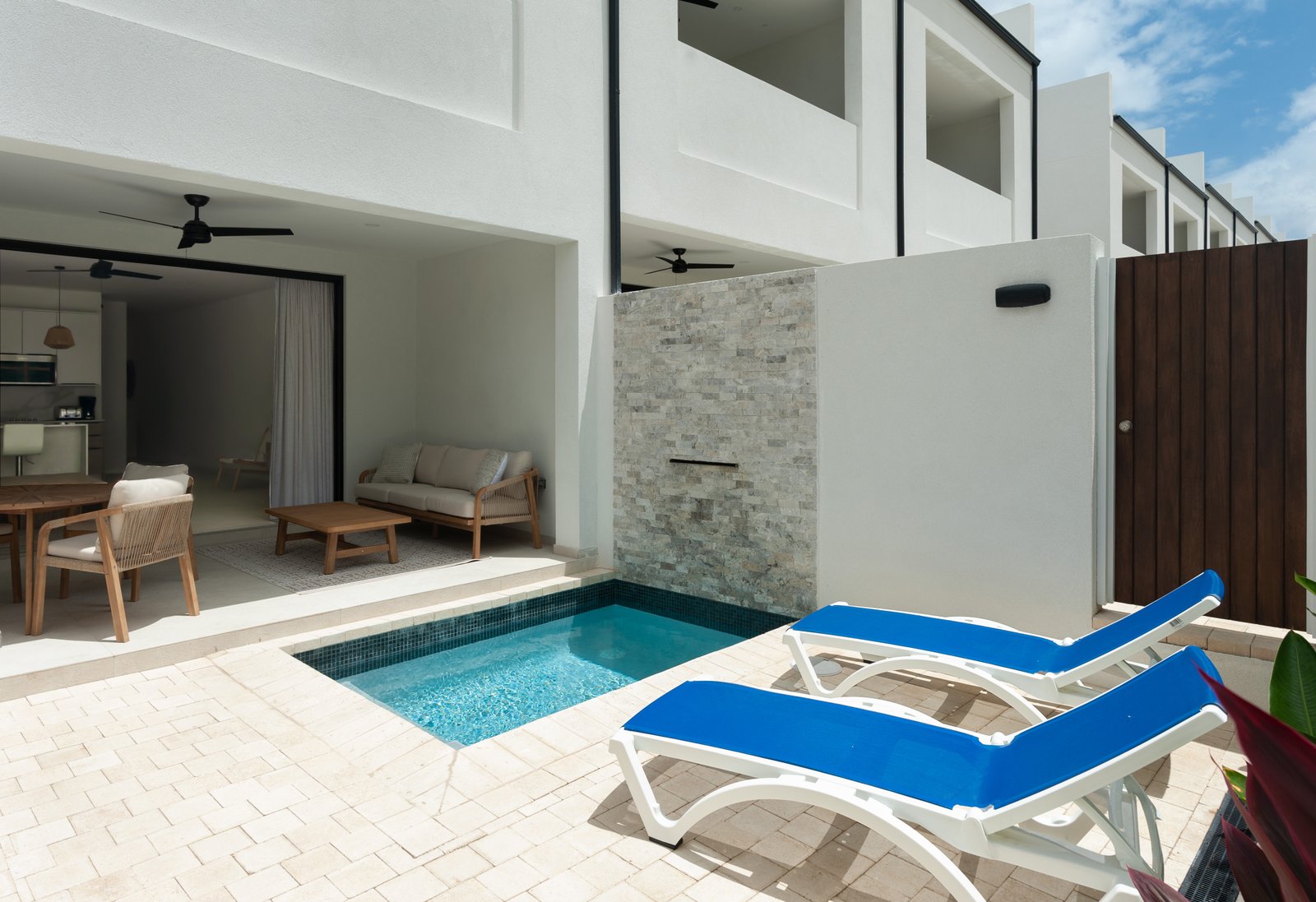 This beautifully finished three-bedroom, three-bathroom townhouse is designed for effortless West Coast living. The open-plan layout is enhanced by recessed ceilings, modern lighting, and clean architectural lines, creating a bright and inviting interior. Large trifold doors open onto a covered patio, seamlessly extending the living space outdoors. Here, a private plunge pool with a waterfall feature, framed by lush tropical landscaping, provides a tranquil setting for relaxing or entertaining.