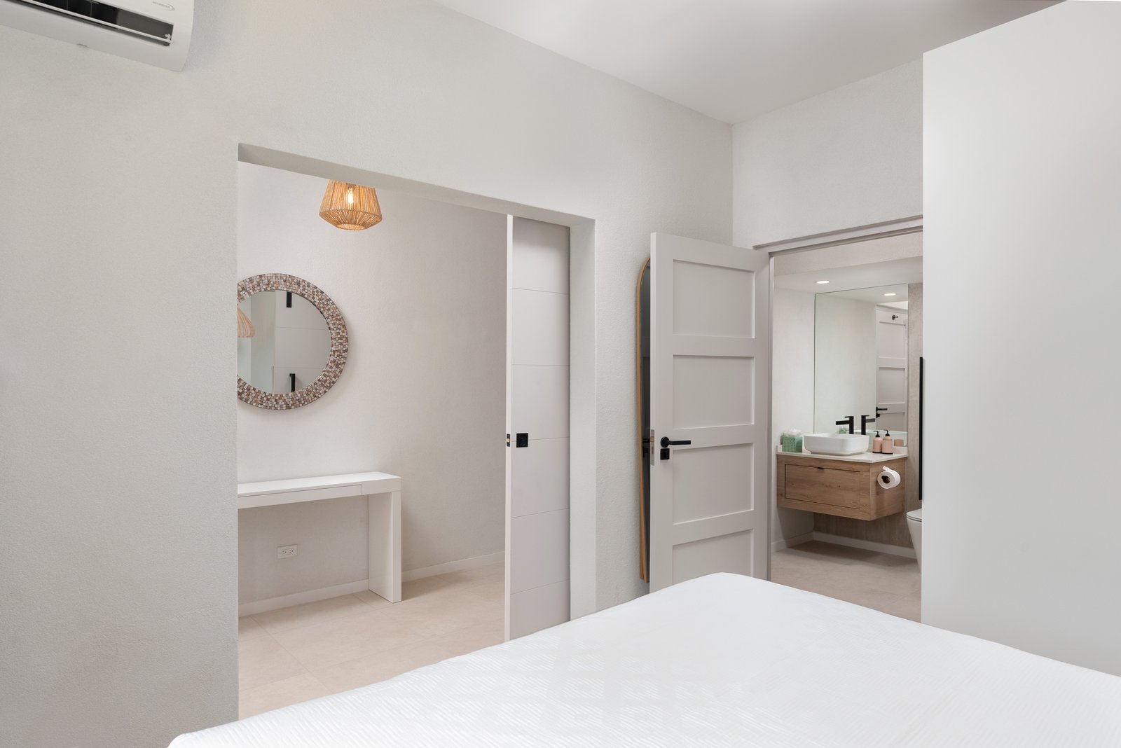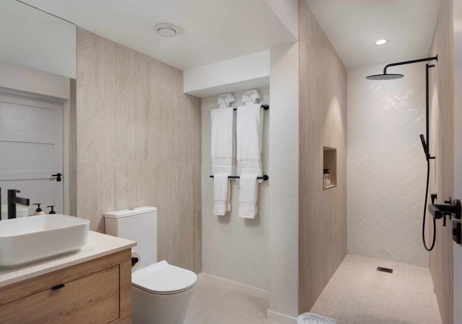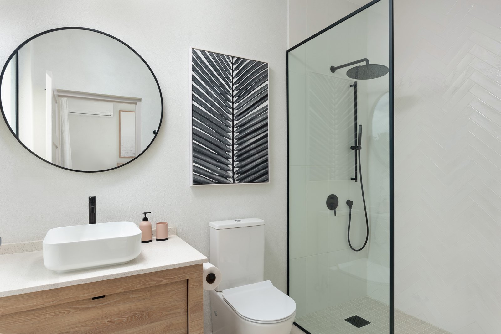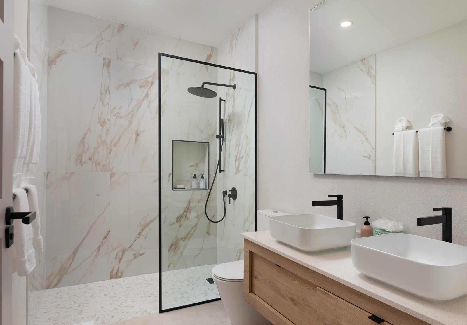 A flexible ground-floor bedroom offers the option of a guest suite or home office. Upstairs, the spacious primary suite and third bedroom both enjoy en-suite bathrooms finished with floating vanities, glass shower enclosures, and generous built-in storage.