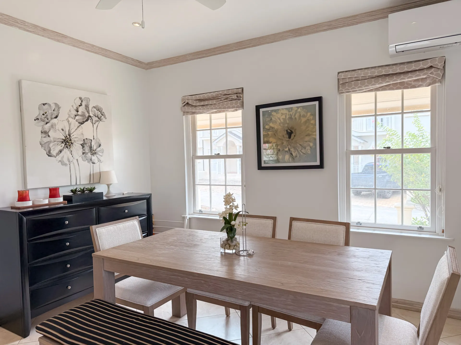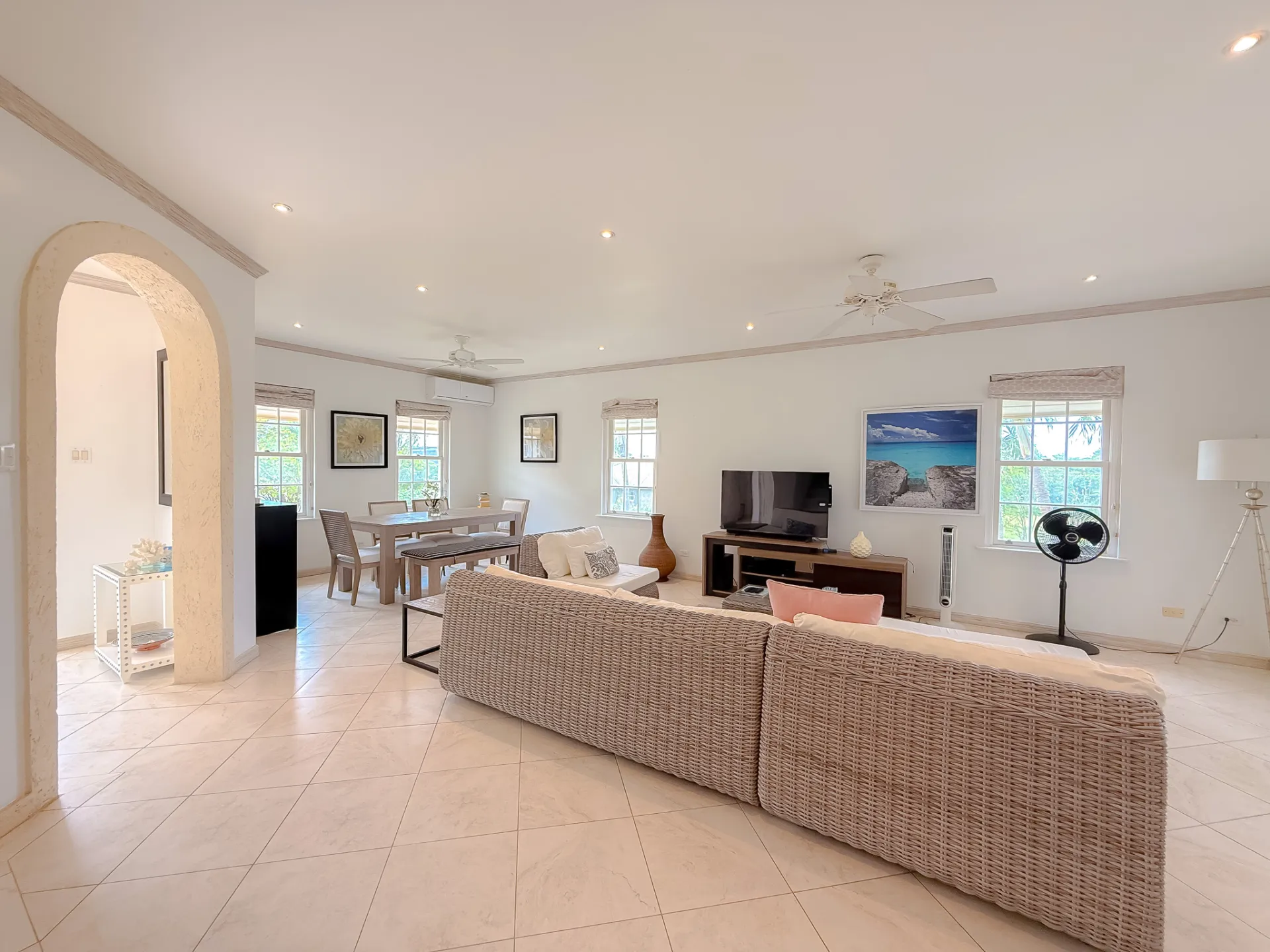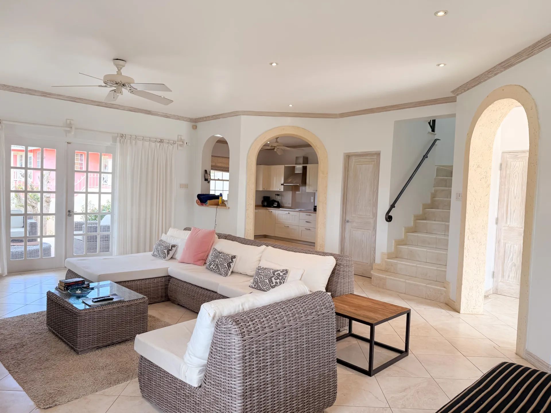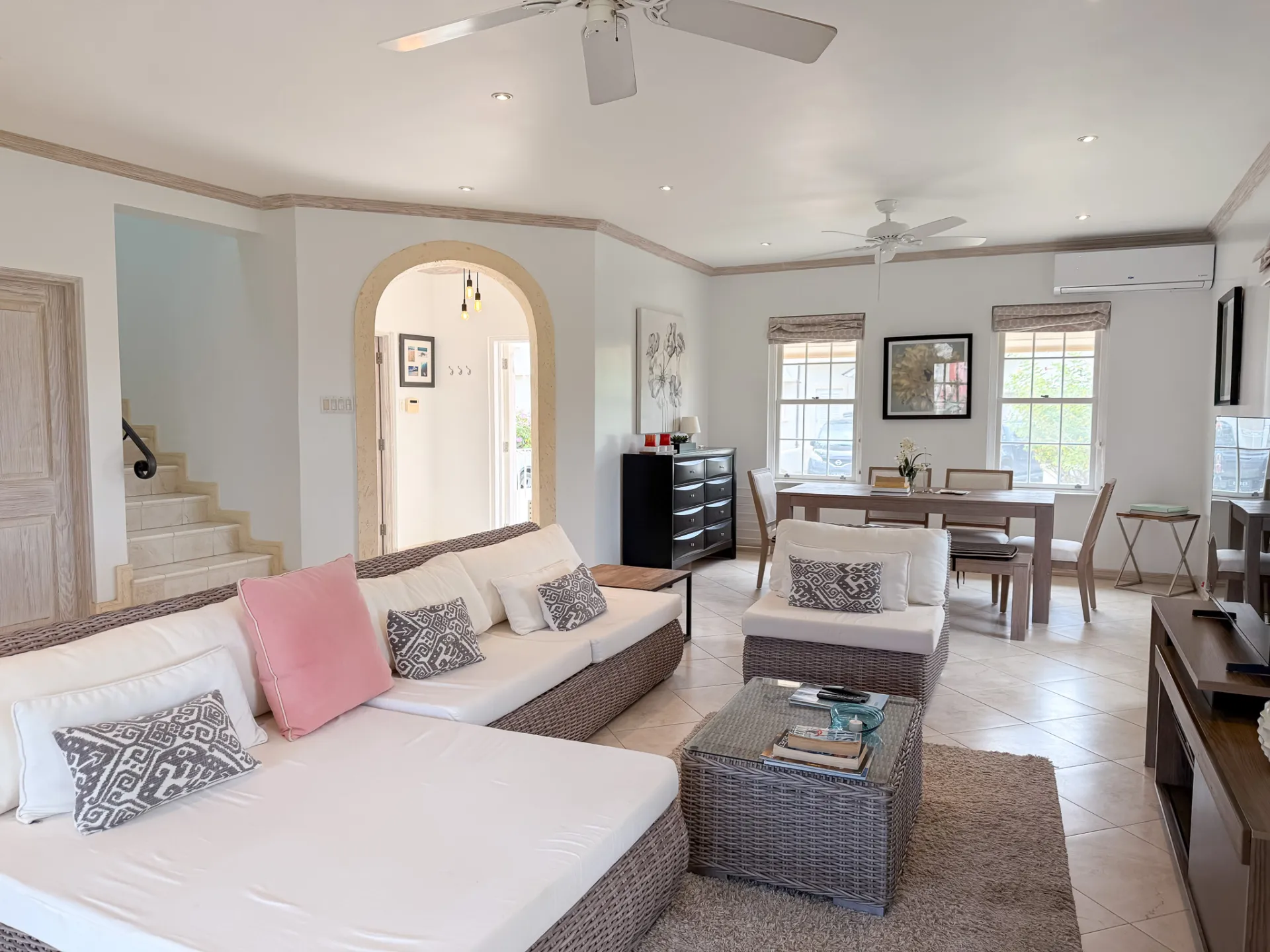 The townhouse features spacious, open-plan living and dining areas filled with natural light, complemented by a modern, fully equipped kitchen. Air conditioning throughout ensures a cool and comfortable environment year-round, while the thoughtfully arranged bedrooms provide a relaxing retreat after a day of exploring Barbados. The primary bedroom offers added privacy, ideal for longer or more restful stays.