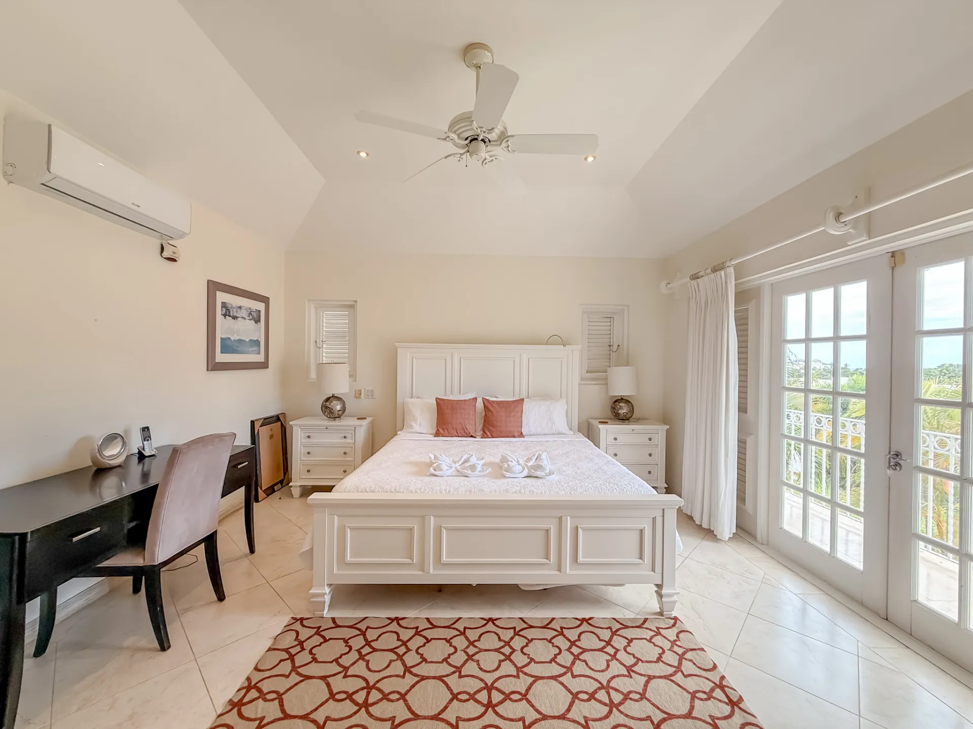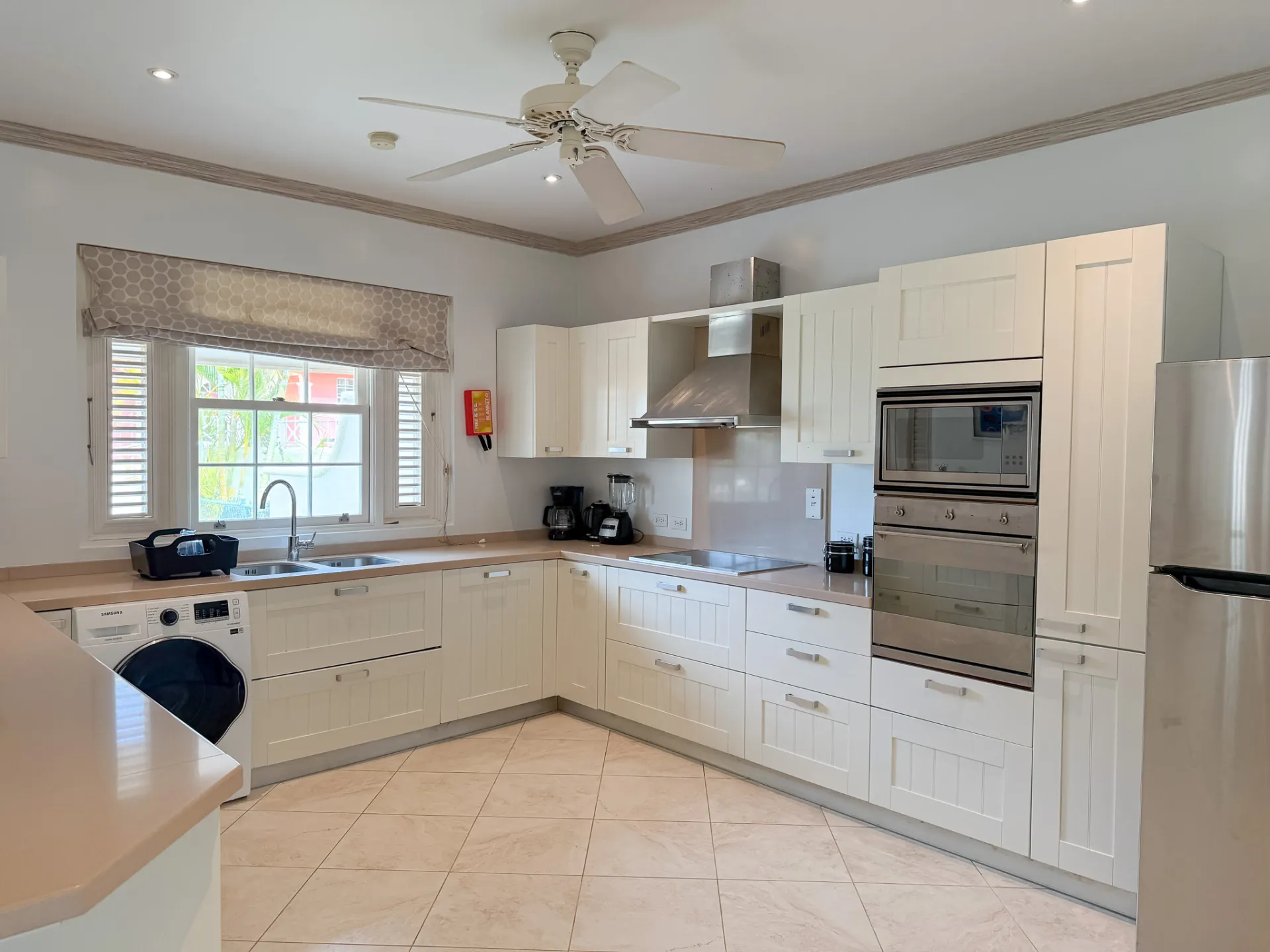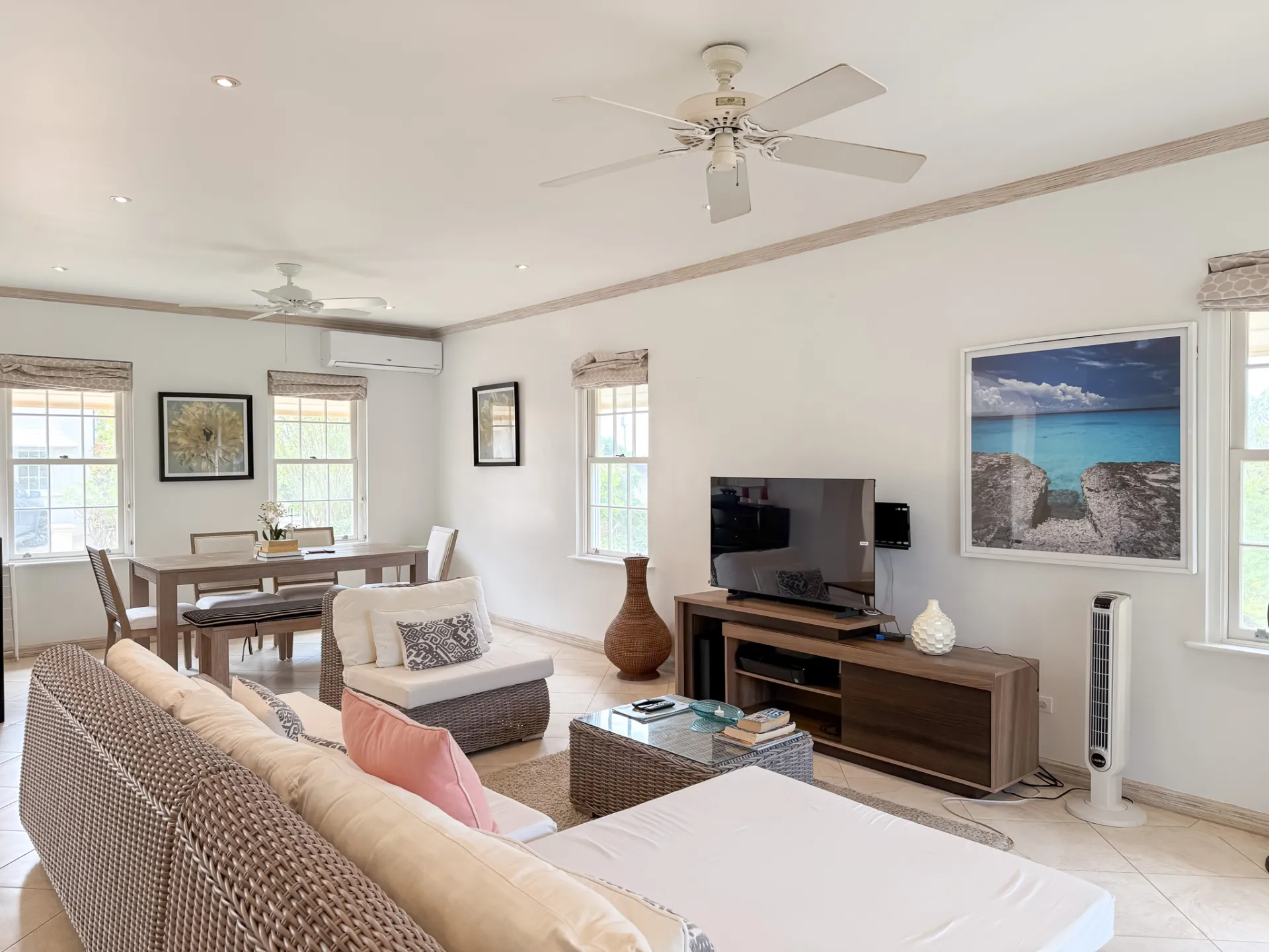 The townhouse features spacious, open-plan living and dining areas filled with natural light, complemented by a modern, fully equipped kitchen. Air conditioning throughout ensures a cool and comfortable environment year-round, while the thoughtfully arranged bedrooms provide a relaxing retreat after a day of exploring Barbados. The primary bedroom offers added privacy, ideal for longer or more restful stays.