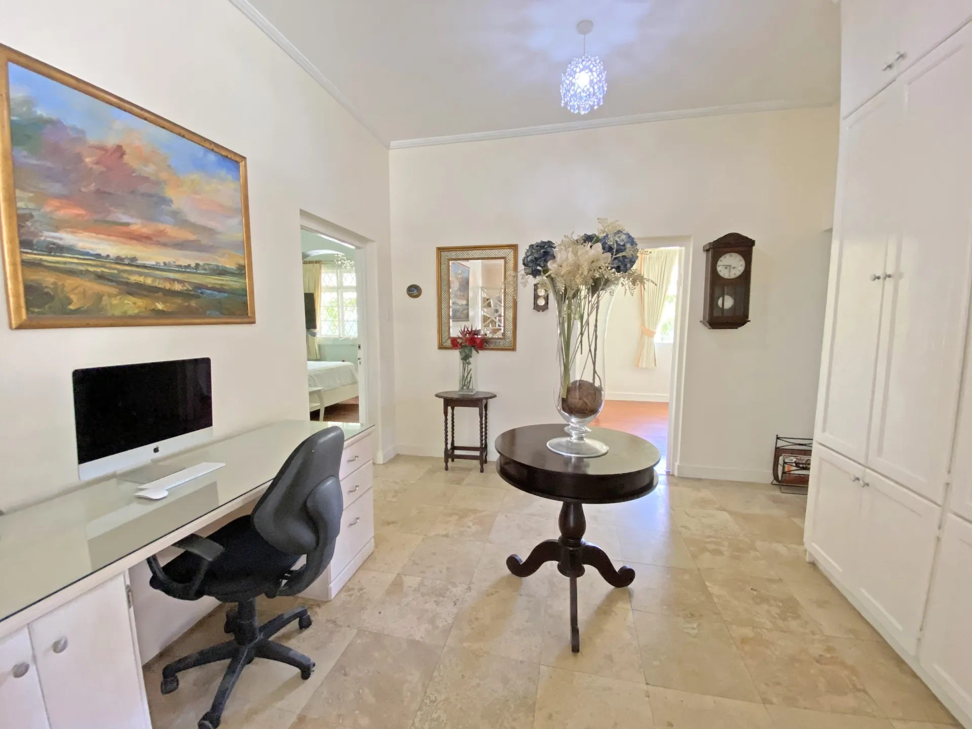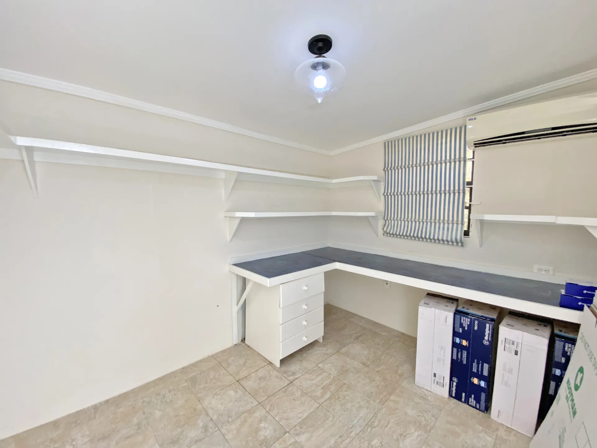 The primary suite includes an ensuite bathroom and a spacious closet, while the second and third bedrooms share a well-appointed bathroom. All bedrooms are air-conditioned to ensure year-round comfort. A dedicated office space located just outside near the laundry and storage areas provides a quiet work-from-home option, complemented by an additional indoor workstation for added flexibility.