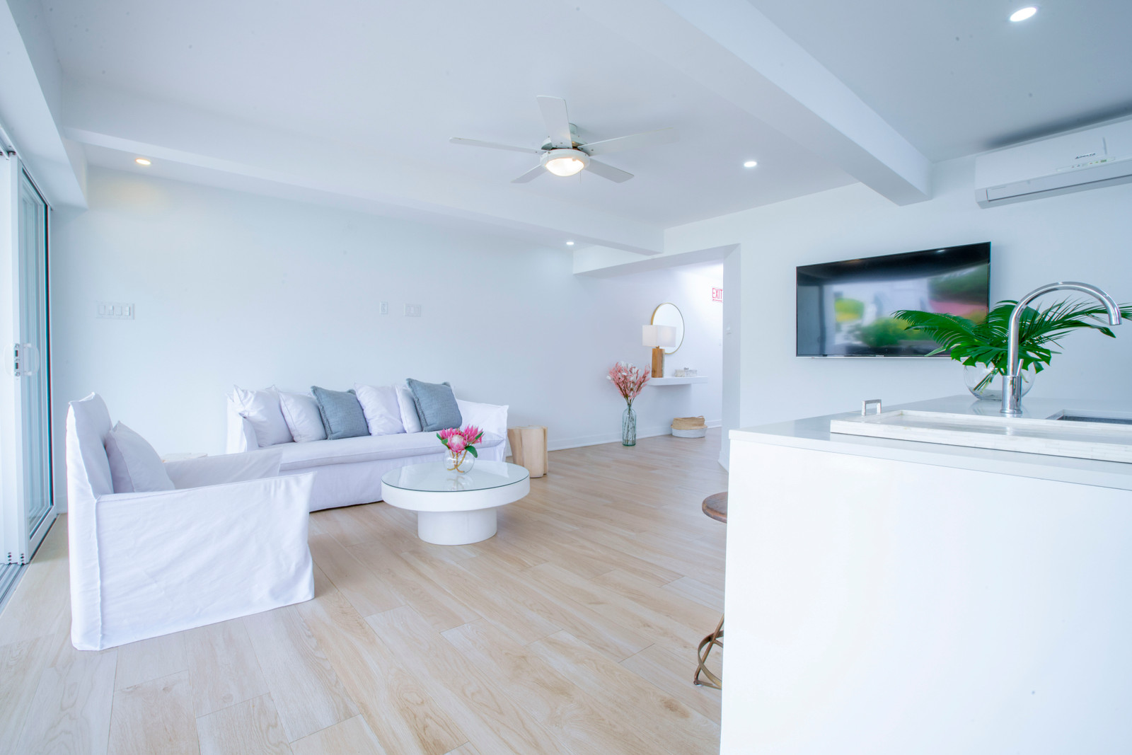 The open-plan living area showcases contemporary yet inviting furnishings from renowned interior designers Restoration Hardware and ABC Carpet & Home NYC. An impressive oversized kitchen island crowned with white marble countertops anchors the space, while expansive white aluminum-framed glass sliding terrace doors open onto a generous covered dining terrace, extending your living area outdoors with breathtaking views of the tropical gardens. Air conditioning and a 55″ Smart TV provide comfort and entertainment with easy streaming from your devices.