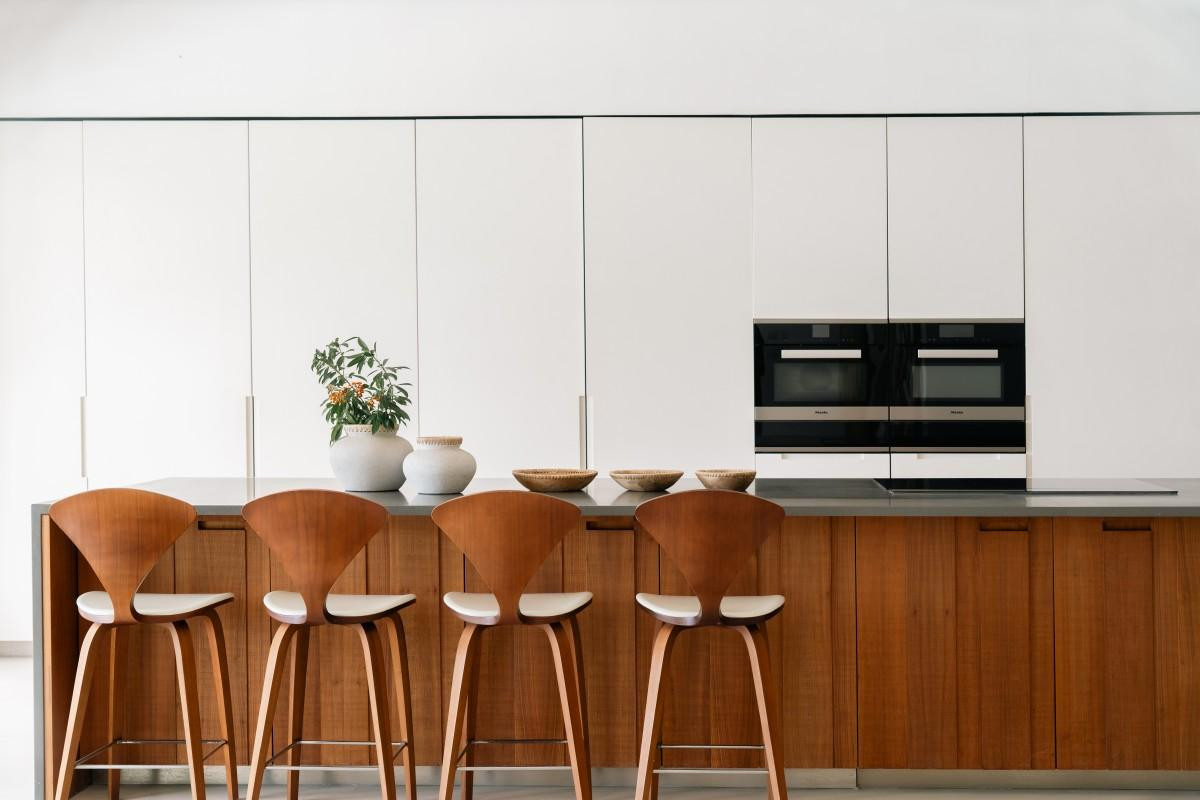 A double staircase with feature Verpan seashell chandelier leads upstairs to five spacious en suite bedrooms. A few have four-poster beds dressed with white linen, and all have American oak flooring, Ralph Lauren bed stools and a smattering of other unique design pieces. Each bedroom has a walk-in dressing room, private terrace and luxury bathroom furnished with Hansgrohe rain shower, mosaic tiles from Ann Sacks and marble vanities. The master suite’s large bathtub sits at the base of a floor-to-ceiling window offering sweeping garden views down to the beach.
