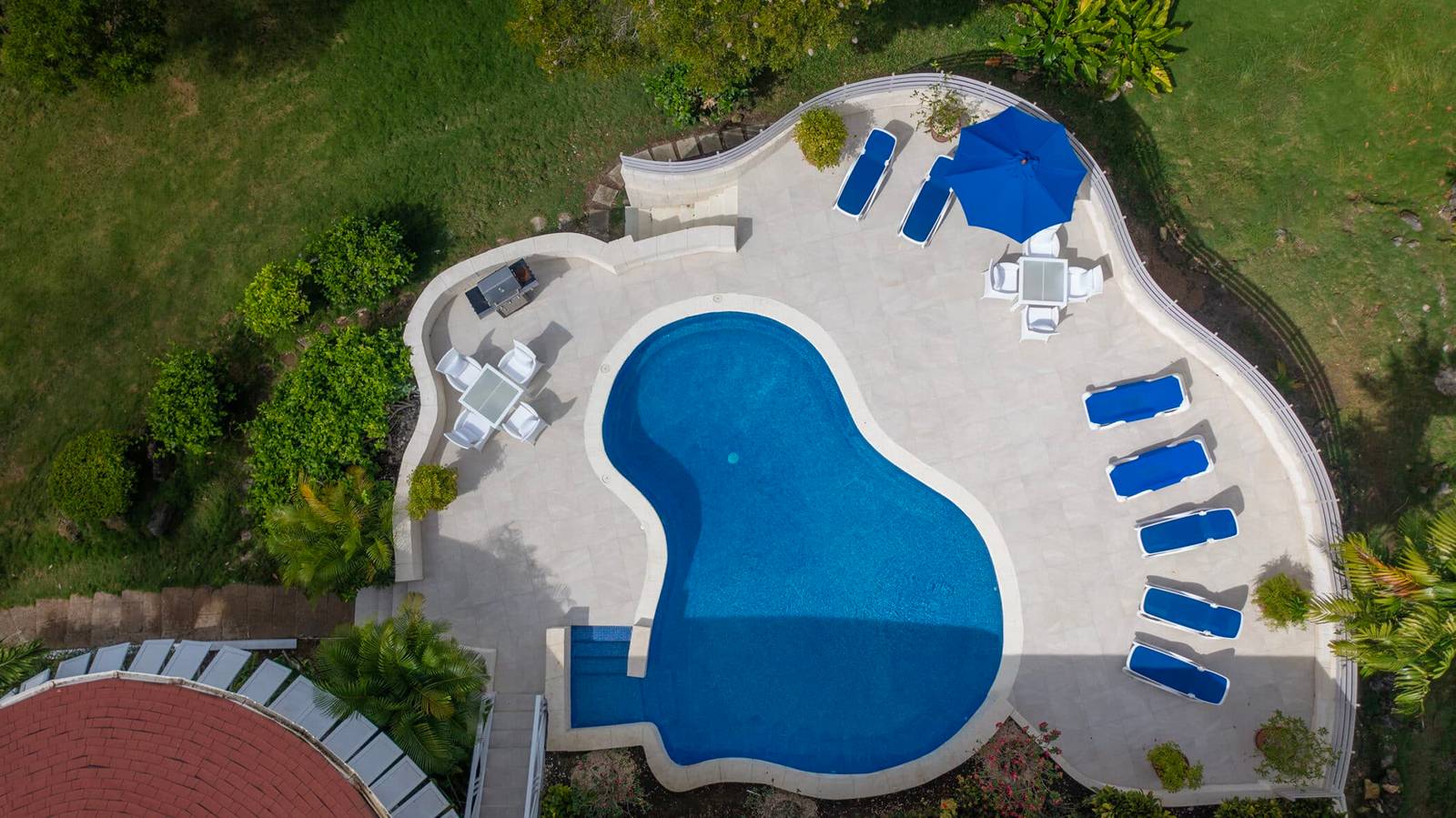 - Large swimming pool with sundeck, loungers and shaded seating.