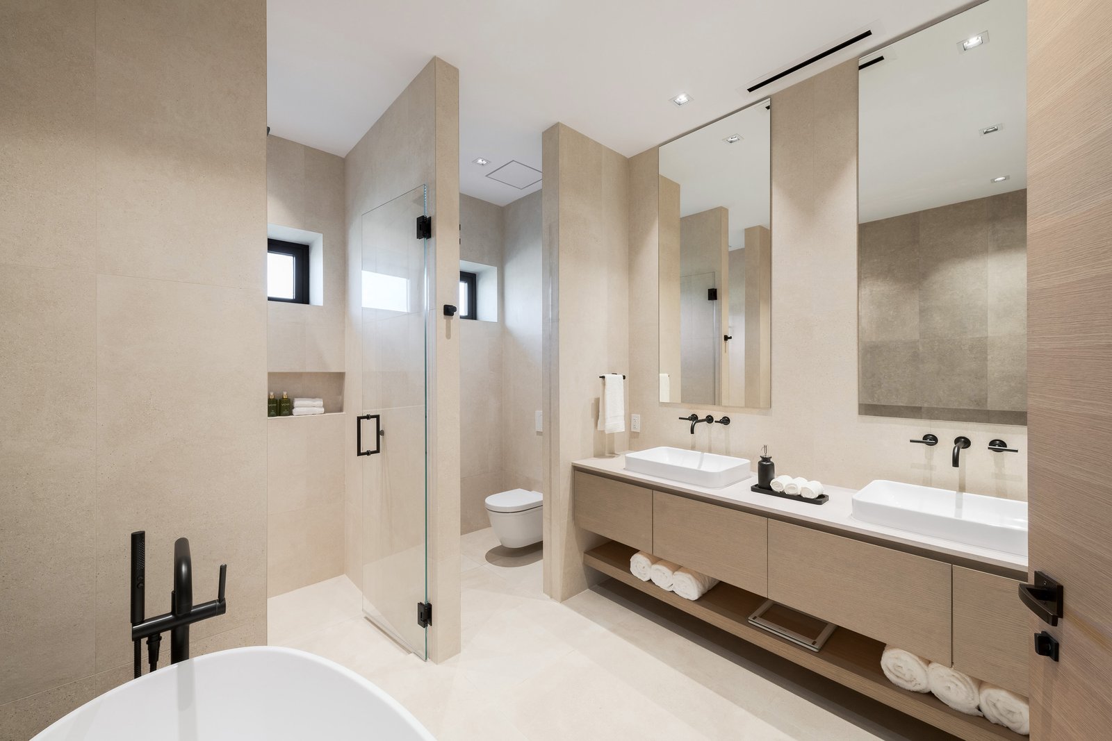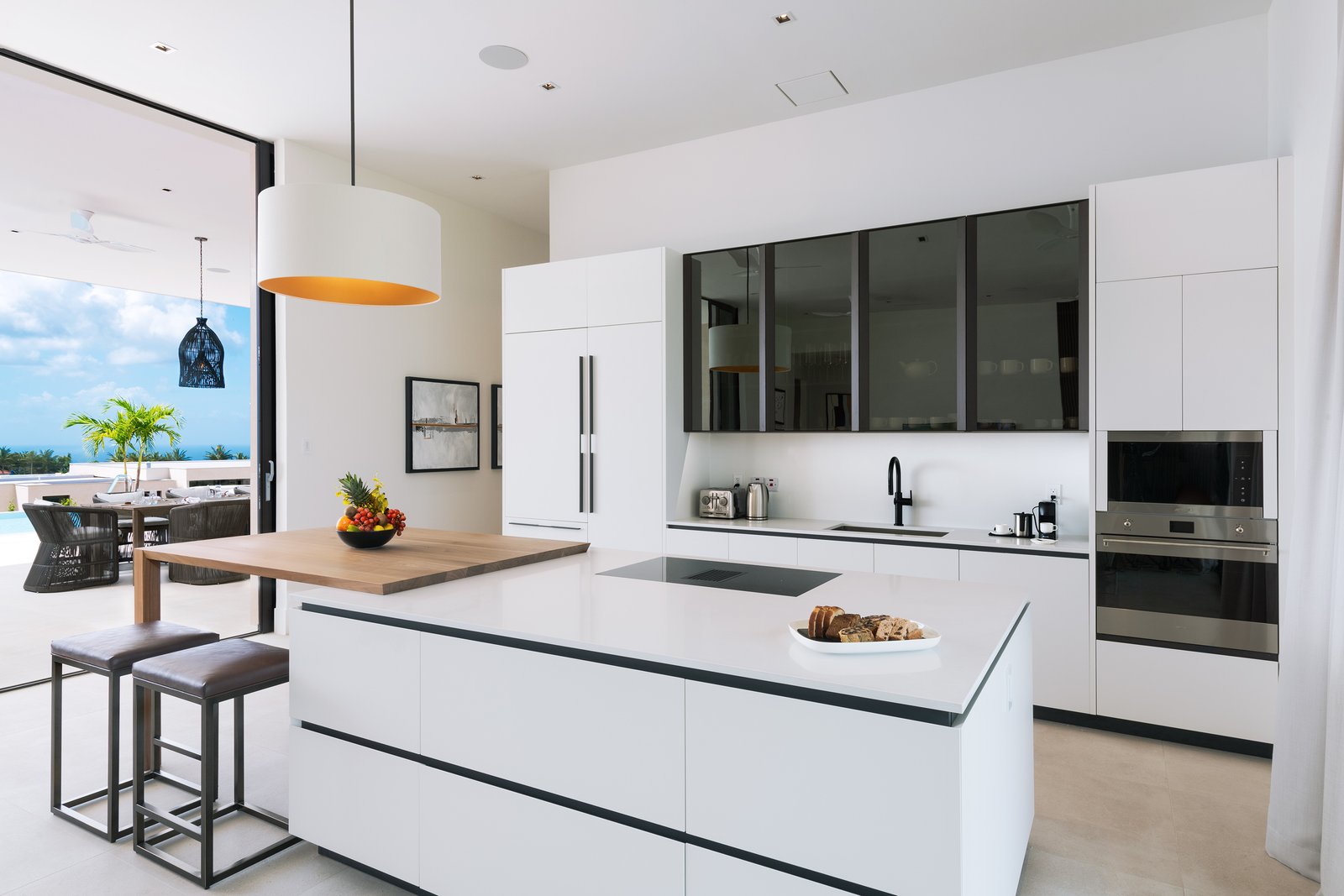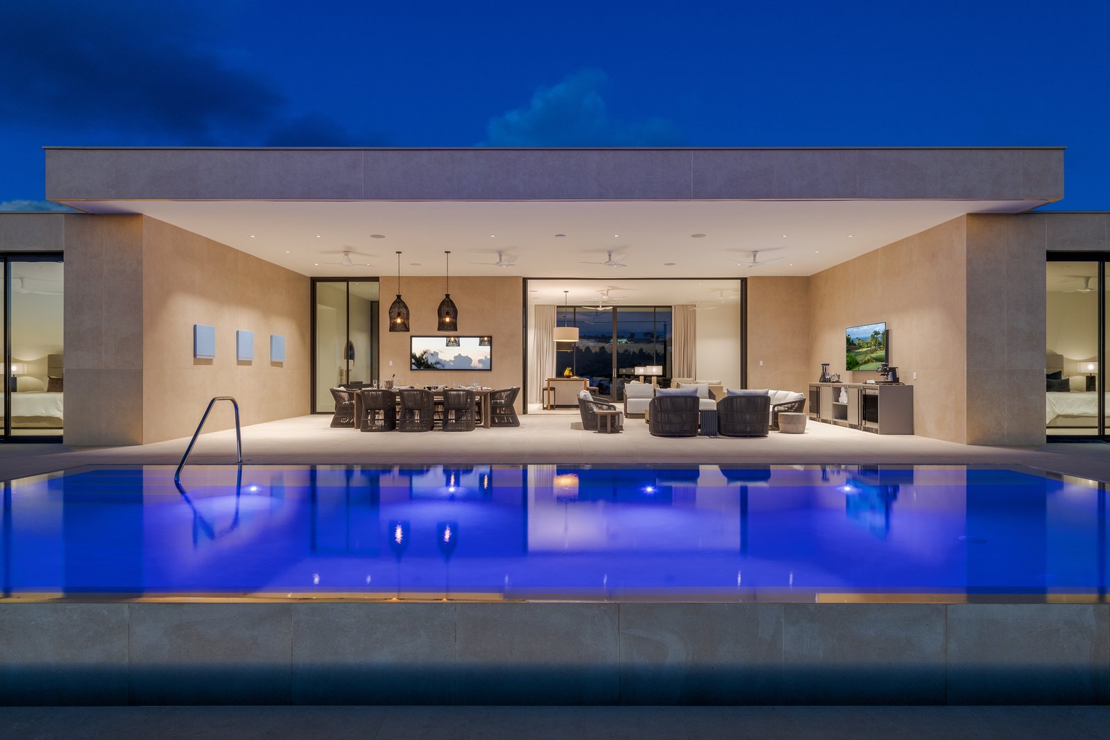 Biophilic design principles shape every detail of the Hilltop Villas. Two generous master suites open directly onto the pool terrace, while 12-foot sliding glass doors extend the shared living space outward to welcome cooling breezes and panoramic sea views. Under the shaded veranda, alfresco dining beside your private pool becomes part of the everyday rhythm of life at Apes Hill—where the outdoors feels like an extension of home.
