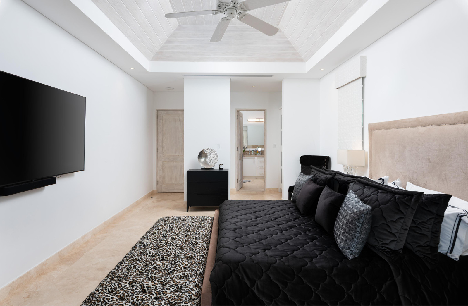 Upon arrival, a private gated driveway with a two-car garage and covered porte-cochère leads into an open-plan kitchen and living area, thoughtfully designed to maximize space and comfort. The home’s modern layout is complemented by high-end finishes, ideal for entertaining or simply enjoying the security and visual beauty of being in Royal Westmoreland.