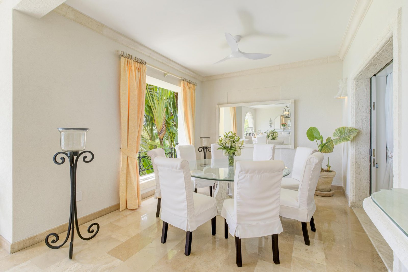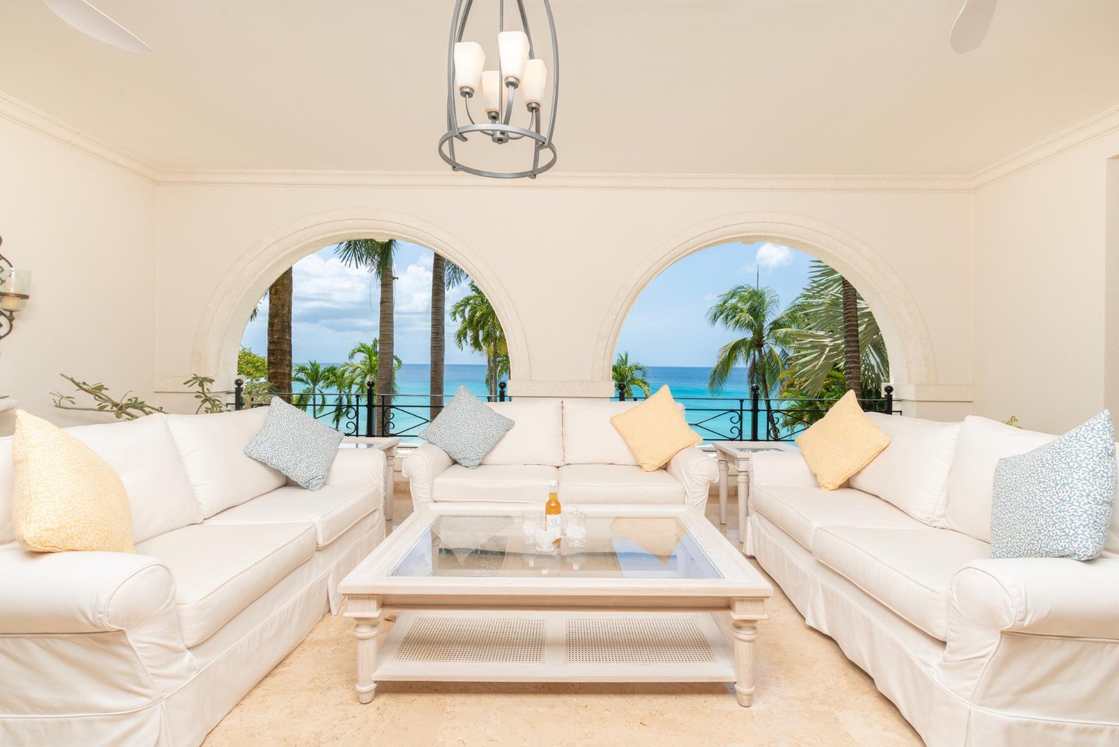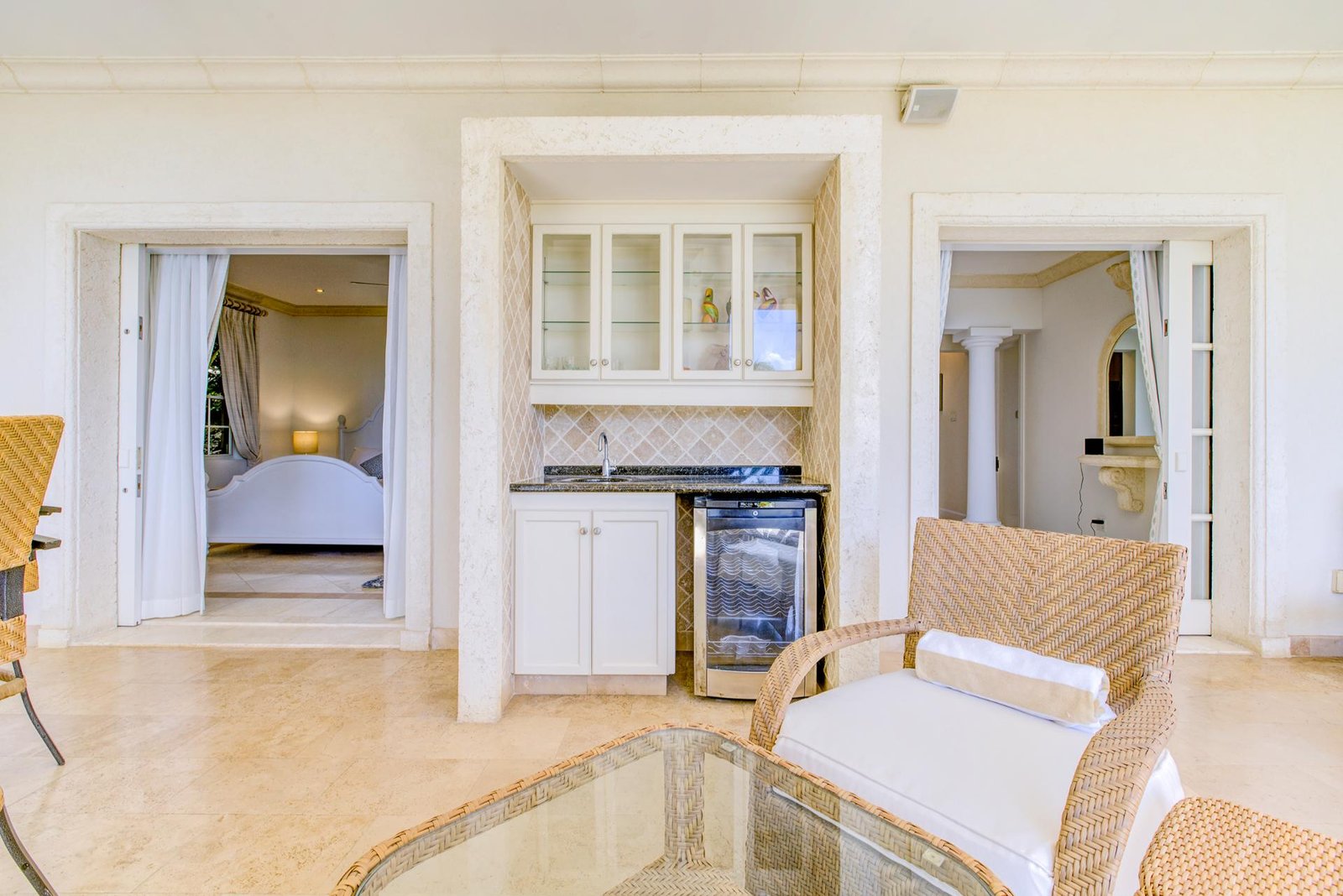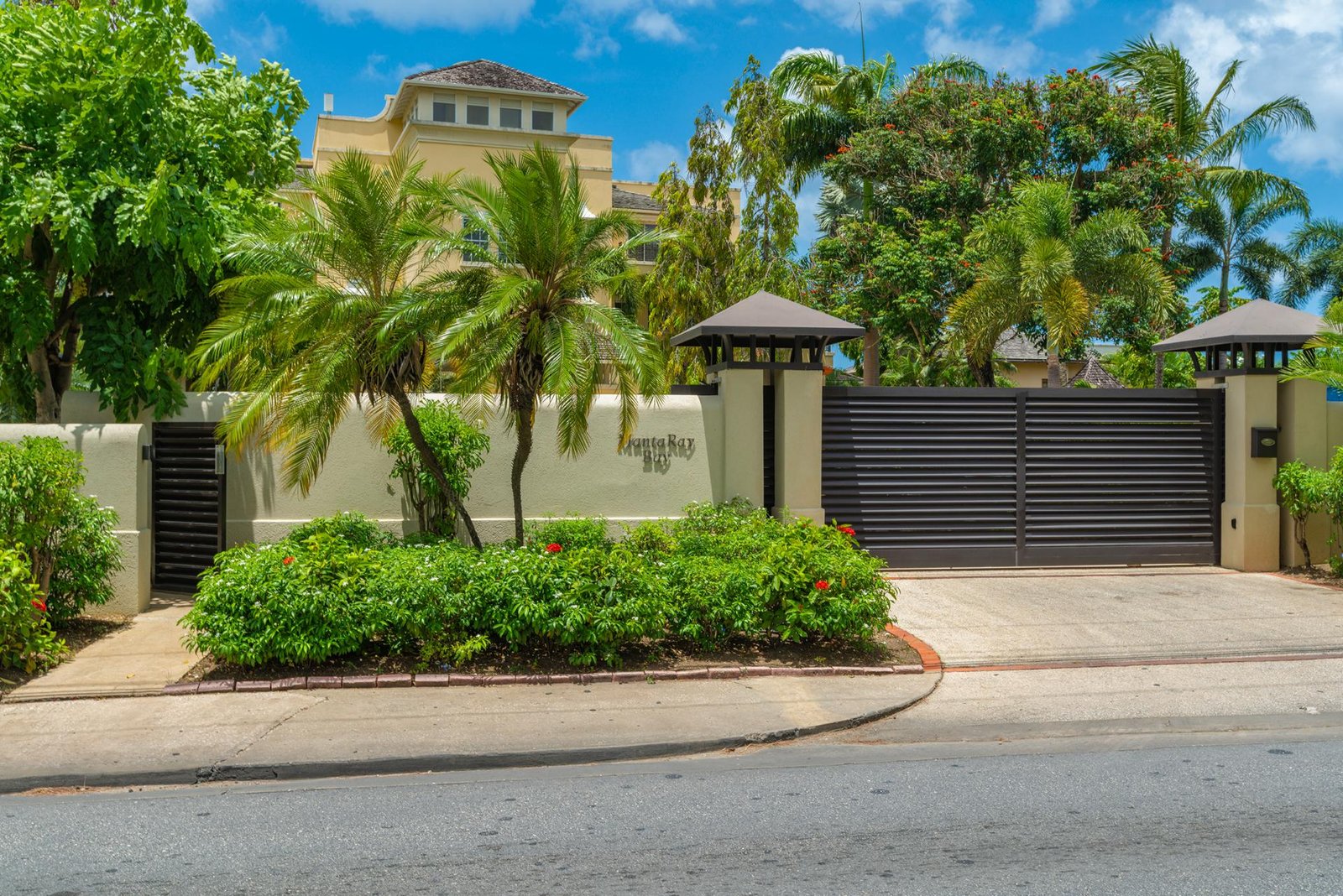 The front entrance of the villa is both grand and welcoming, framed by soft yellow walls and tropical greenery. A stately arched gateway leads into a covered portico, opening to a tranquil courtyard with a central water feature. The architecture blends classic Caribbean charm with Mediterranean touches, creating an elegant first impression. Surrounded by swaying palms and lush landscaping, the approach feels private and secure, setting the tone for the luxurious retreat that awaits inside.