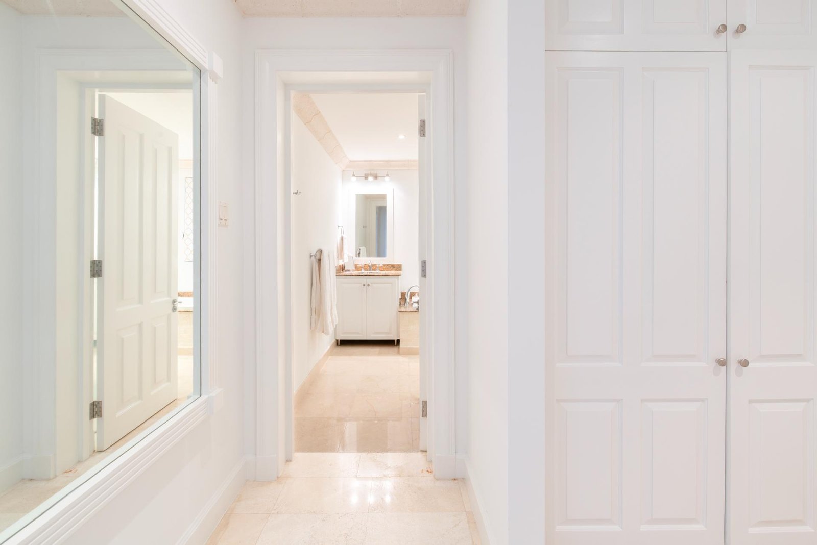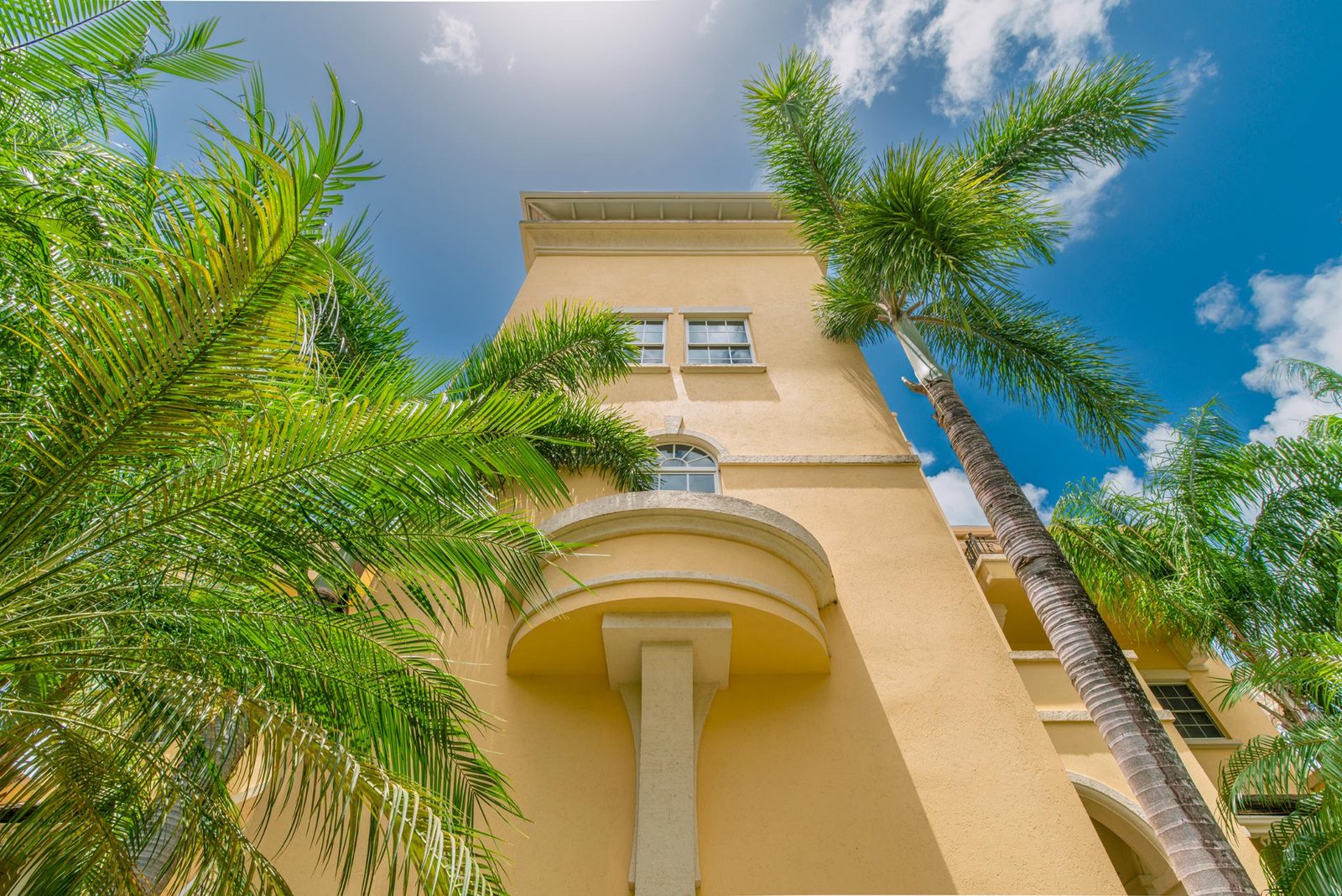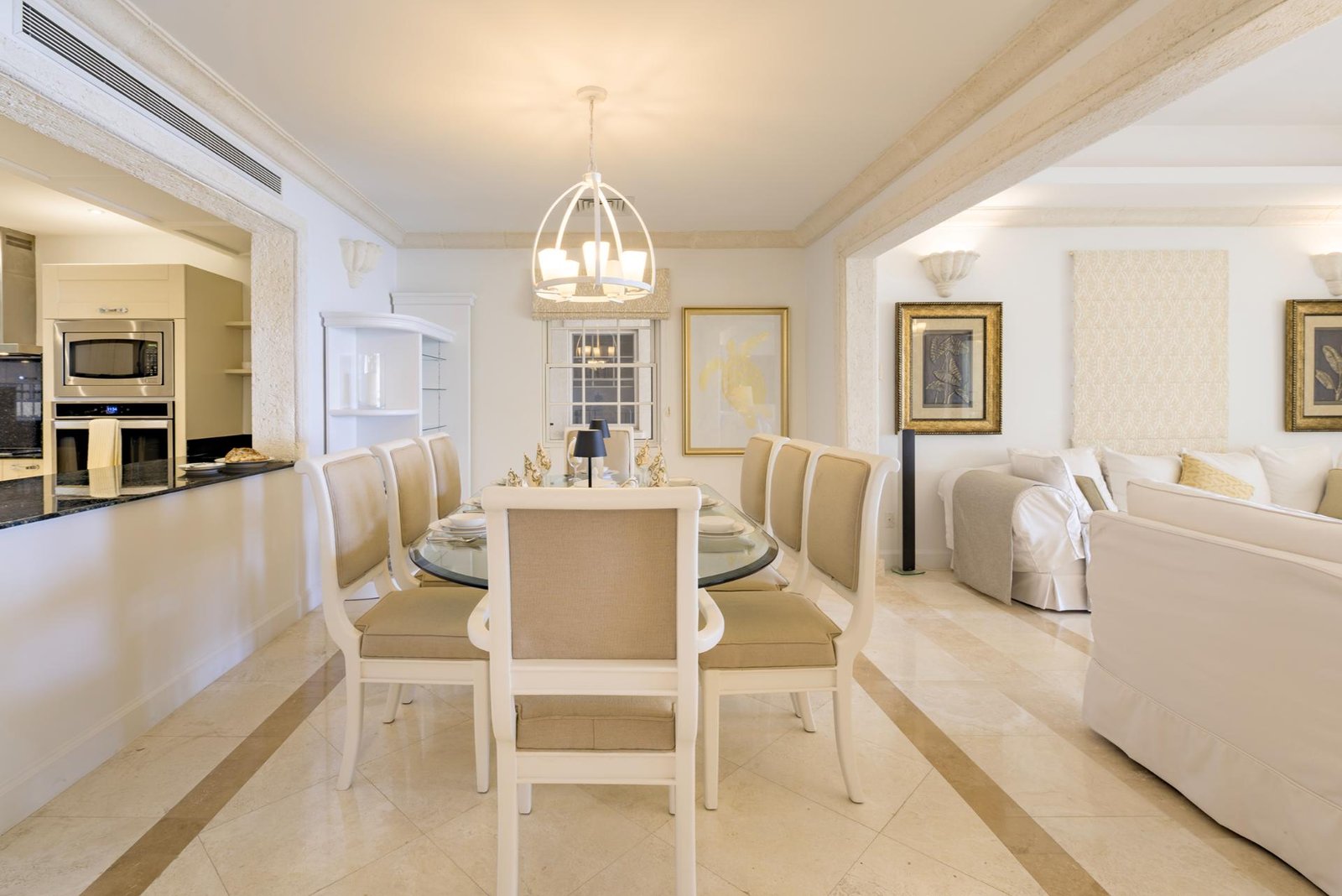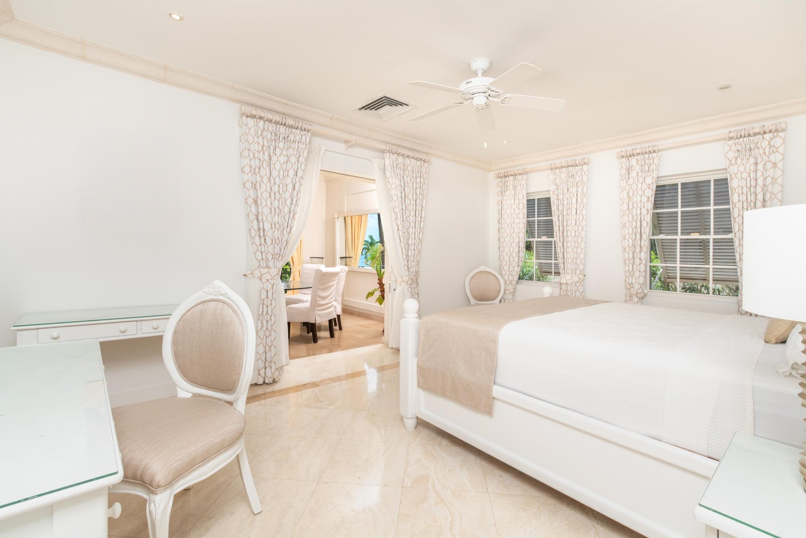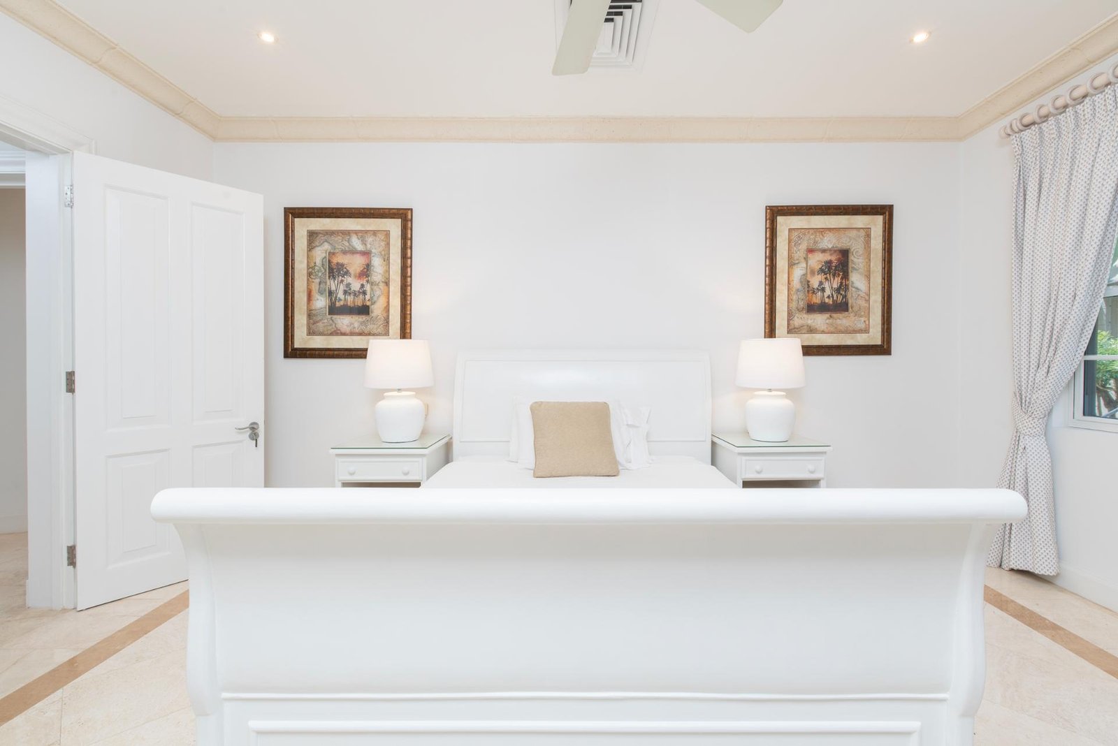 The front entrance of the villa is both grand and welcoming, framed by soft yellow walls and tropical greenery. A stately arched gateway leads into a covered portico, opening to a tranquil courtyard with a central water feature. The architecture blends classic Caribbean charm with Mediterranean touches, creating an elegant first impression. Surrounded by swaying palms and lush landscaping, the approach feels private and secure, setting the tone for the luxurious retreat that awaits inside.
