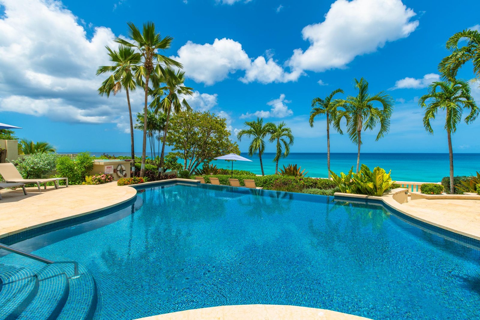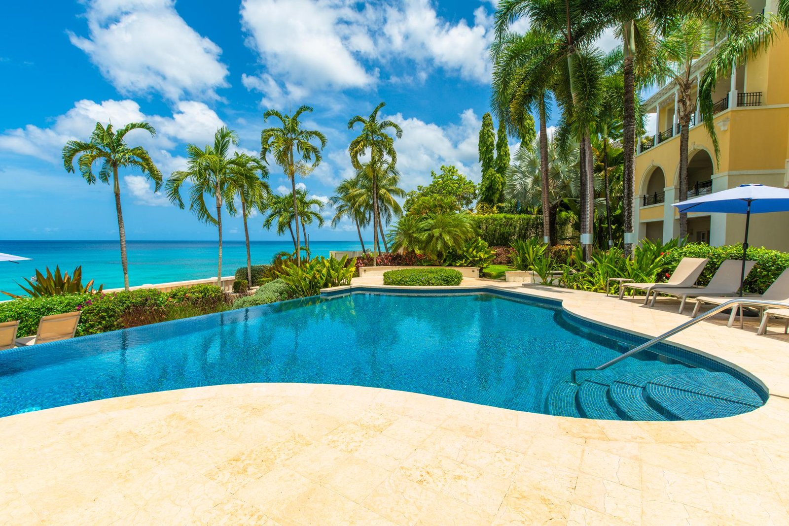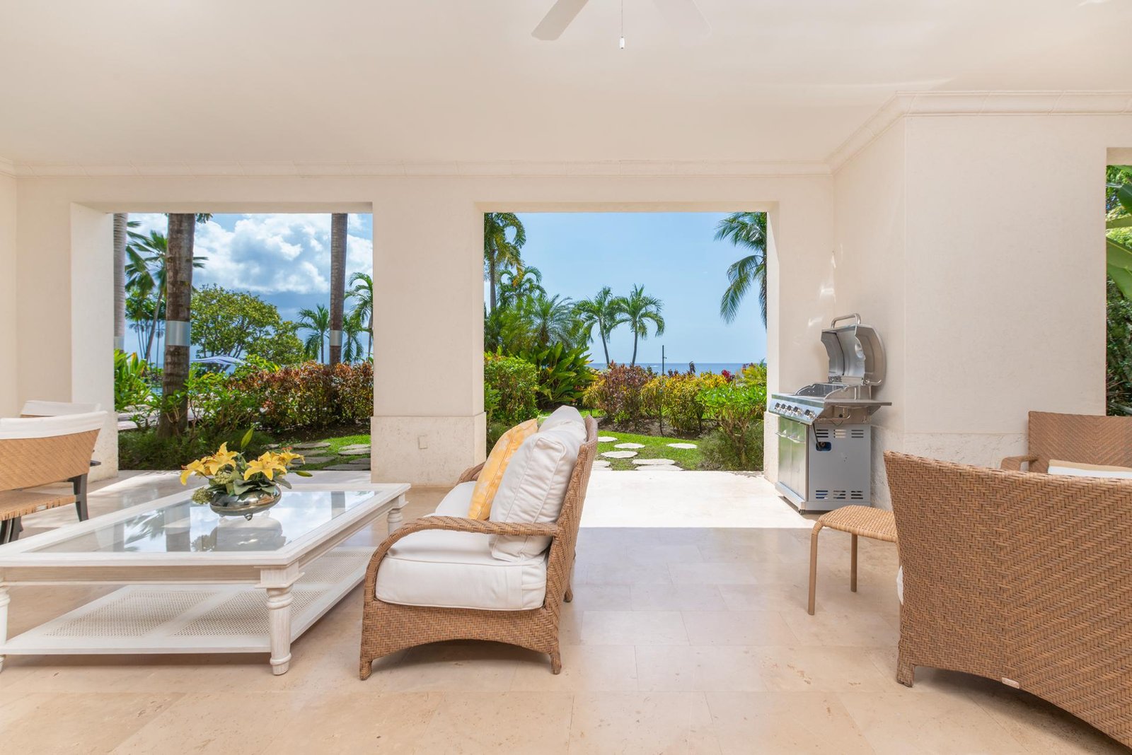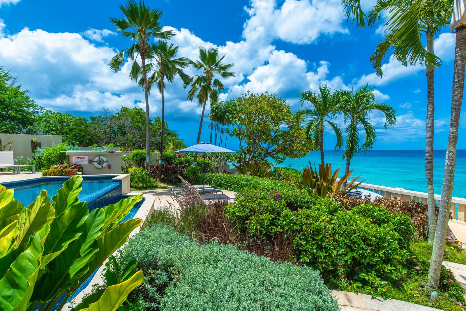 The terrace flows into beautifully landscaped gardens and a large shared freeform pool, framed by coral stone balustrades and shaded royal palms. A wooden boardwalk along the bluff invites evening strolls with captivating ocean views, while a private gate leads to an unspoiled, powder-soft beach below.