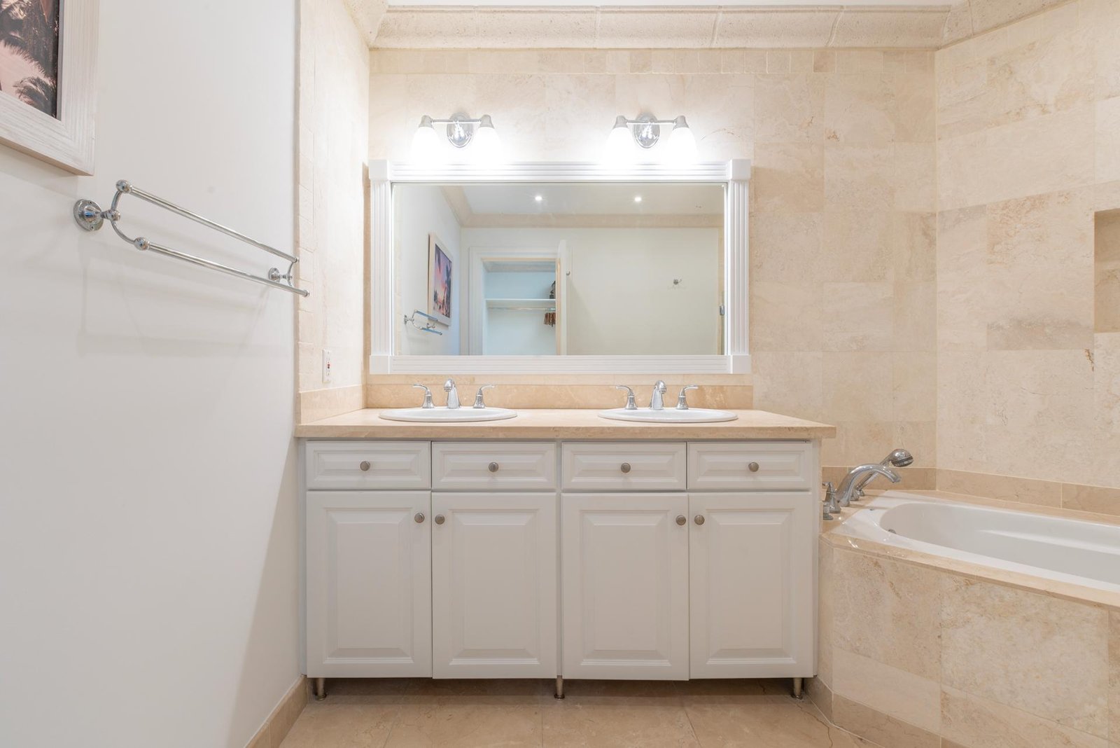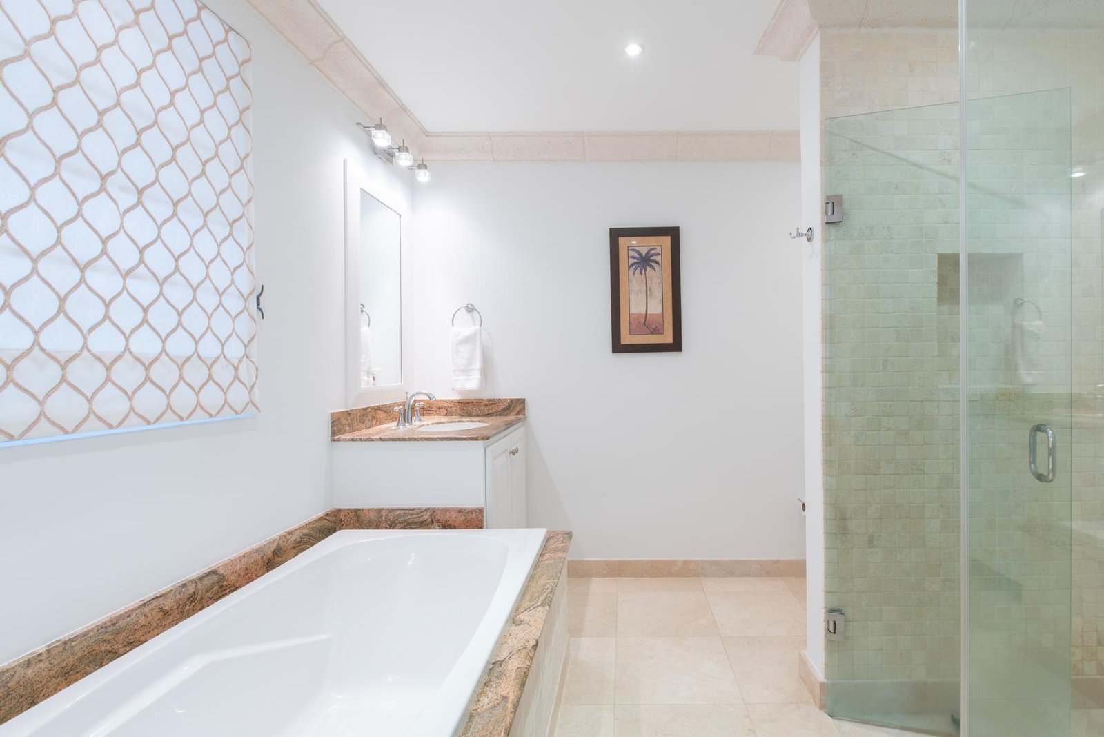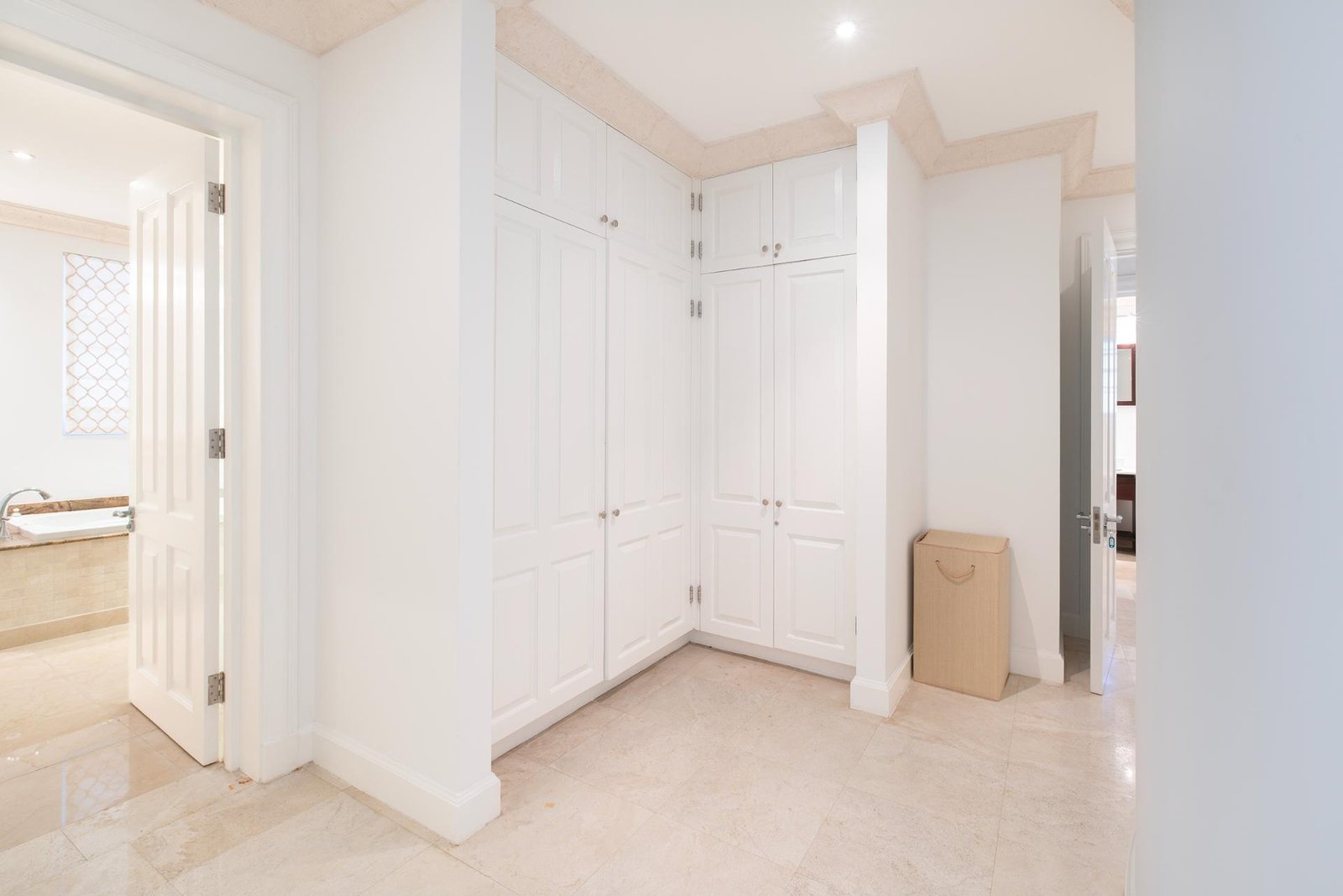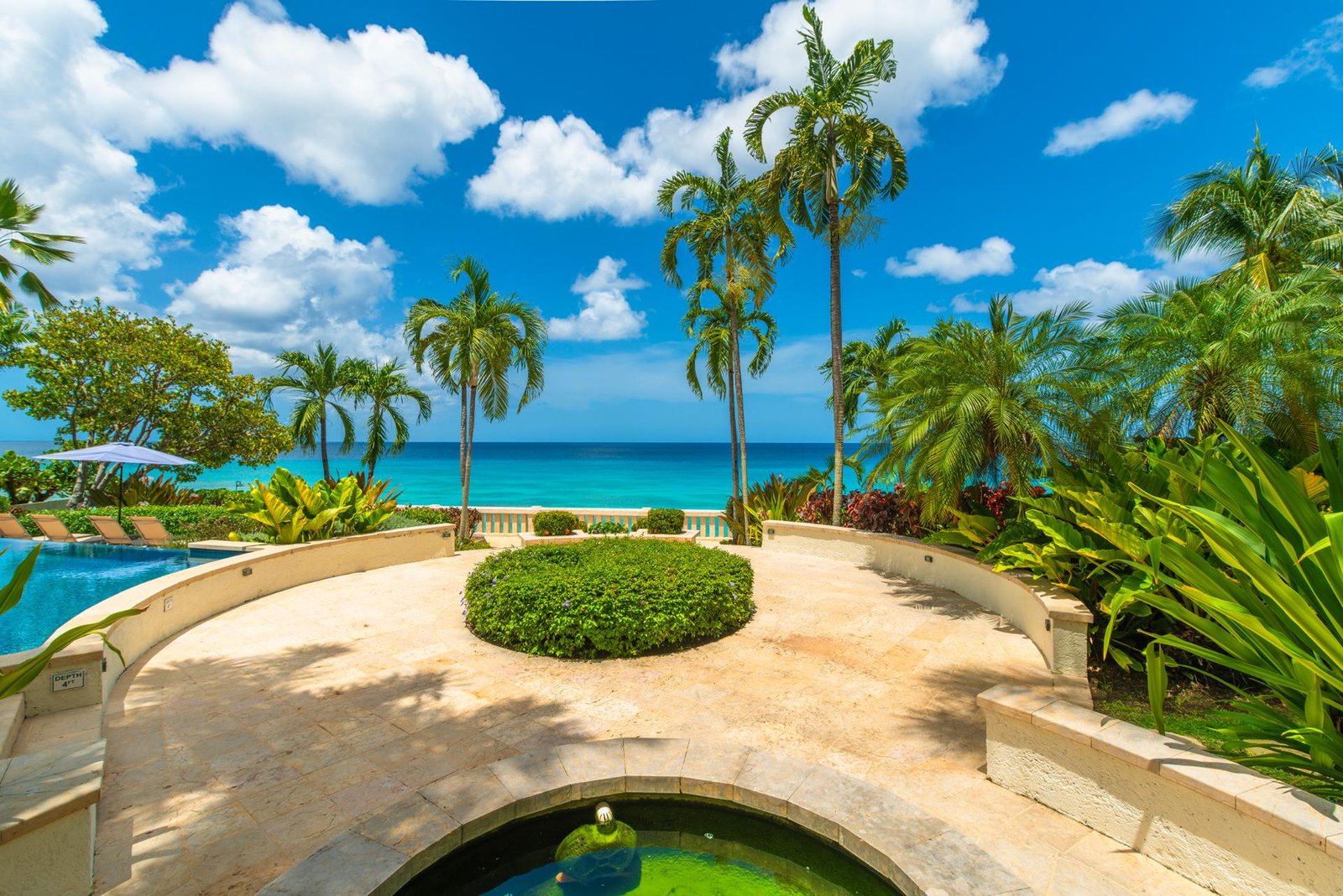The terrace flows into beautifully landscaped gardens and a large shared freeform pool, framed by coral stone balustrades and shaded royal palms. A wooden boardwalk along the bluff invites evening strolls with captivating ocean views, while a private gate leads to an unspoiled, powder-soft beach below.