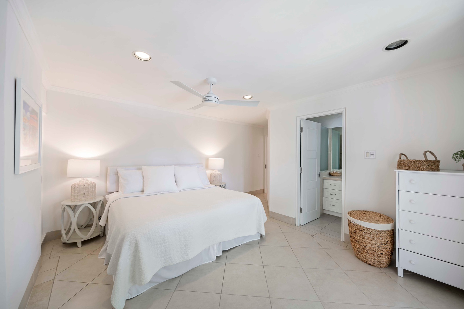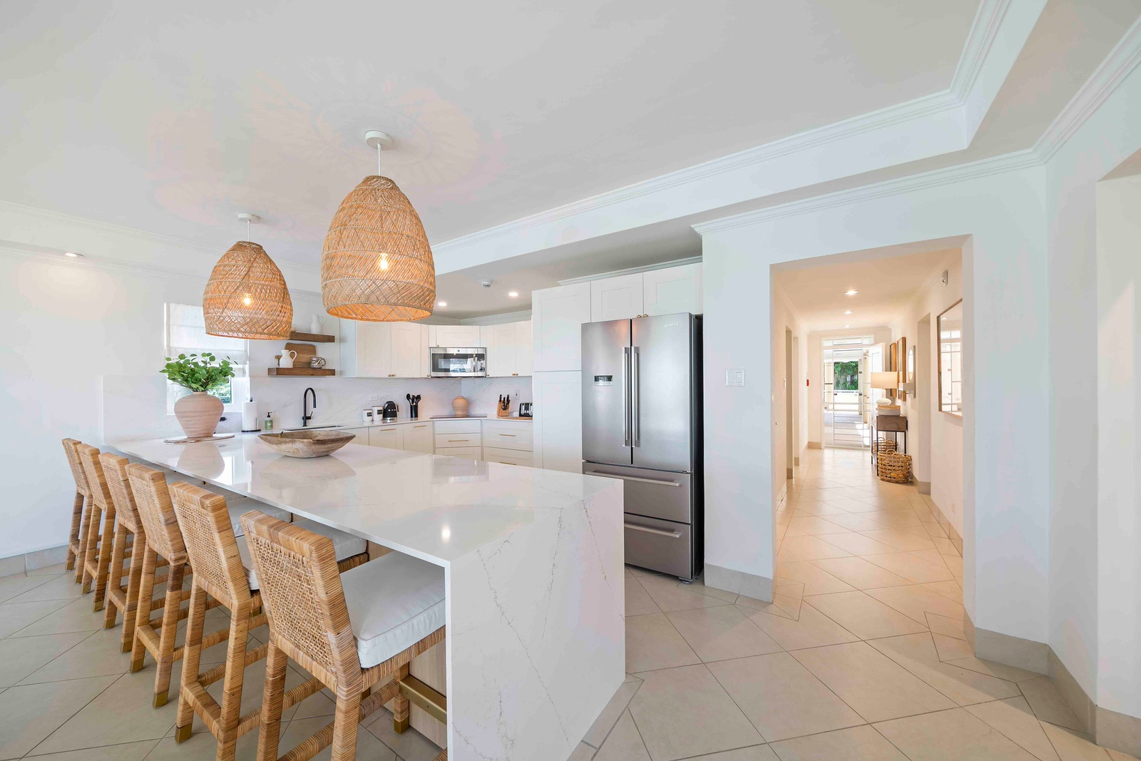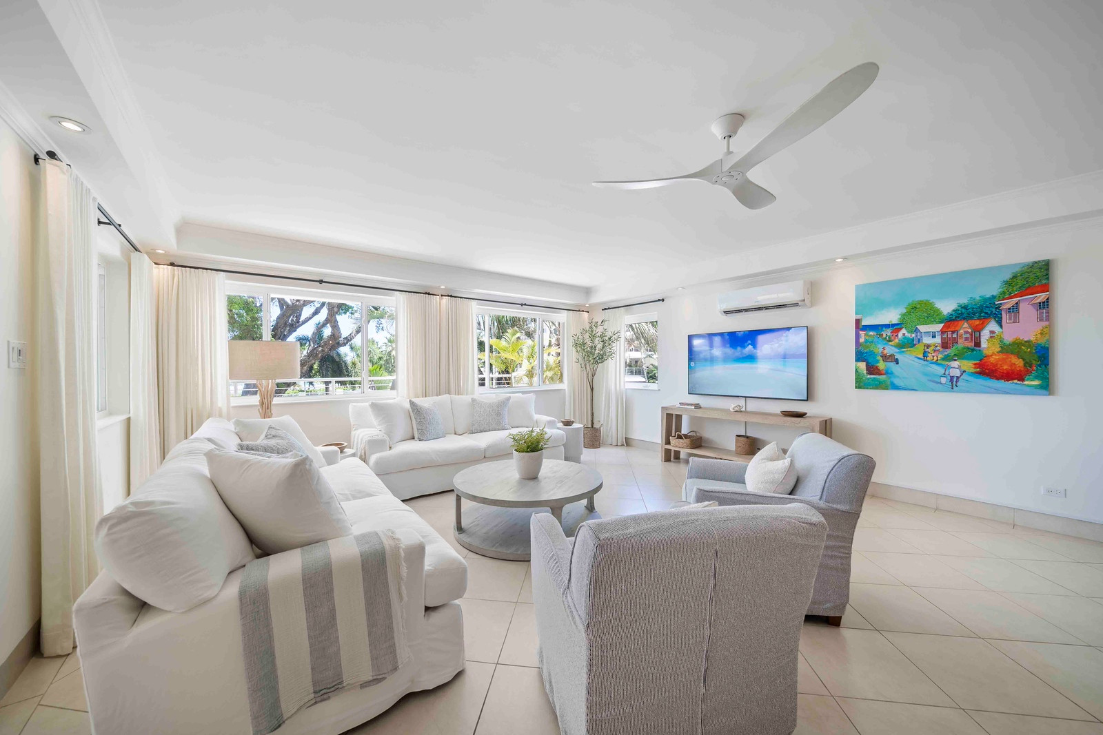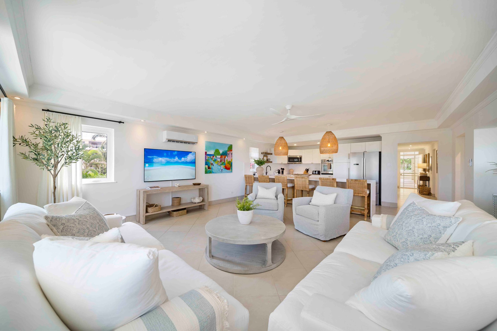 Step into a meticulously designed retreat exuding a serene ambiance through its tasteful décor in soothing light hues, perfectly complementing the vibrant tropical atmosphere of beachfront living. Each of the three bedrooms is equipped with refreshing air conditioning and features its own private ensuite bathroom, with the master suite boasting a rejuvenating shower, soaking tub, and an expansive walk-in closet. Additionally, guests can benefit from the convenience of an extra powder room situated near the entrance.