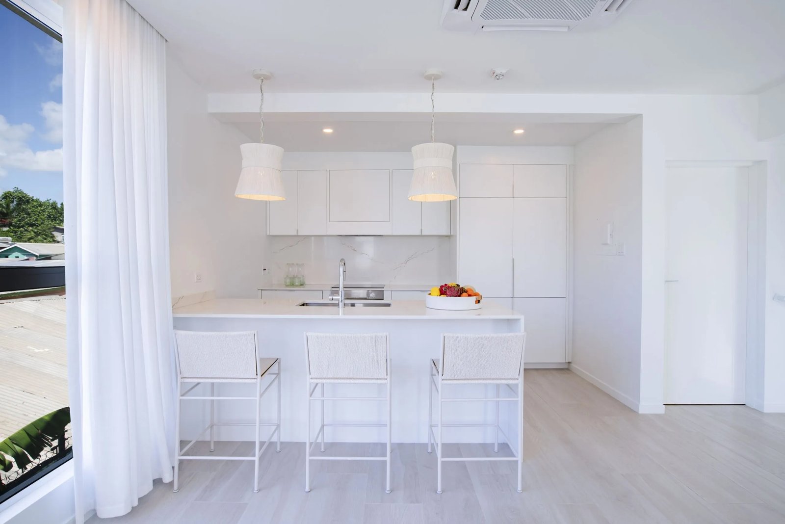 Upon entering, you are greeted by enchanting decorative lighting and large windows that frame the lush Caribbean landscape, setting a tranquil and inviting ambiance. The living room is adorned with exquisite decor, creating a serene retreat for relaxation and leisure. The master suite and guest bathroom are appointed with lavish features, including a double vanity and a walk-in shower with dual options in the master suite. The guest bathroom showcases a glass-paneled walk-in shower and a sophisticated white marble single vanity. The open-plan living area and kitchen offer an unparalleled experience, featuring handcrafted marble surfaces and fully integrated appliances.