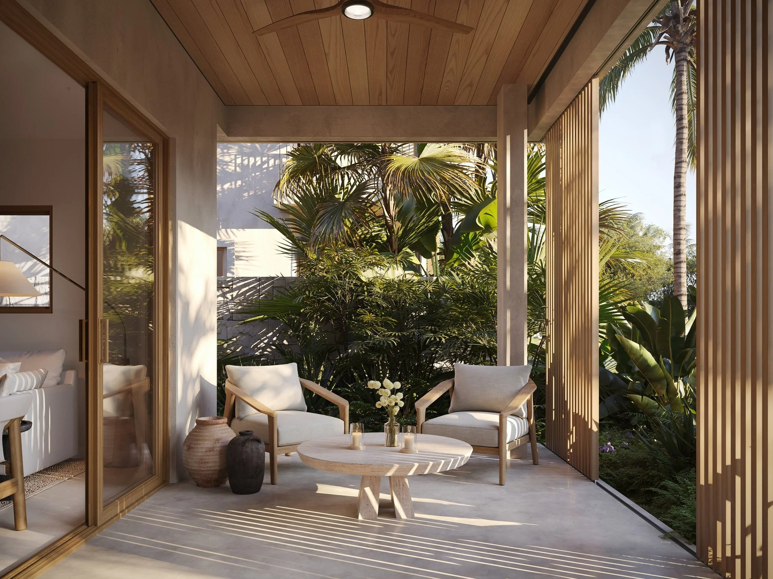 The Ground Floor units of Phase 2 offer effortless elegance and comfort, featuring approximately 1,117 square feet of refined interior space with the same high-end finishes that define Porters Palms. An approximately 184 square foot covered patio extends the living area outdoors, along with up to 1,144 square foot of tranquil lush tropical outdoor space. Residents enjoy access to the expansive communal luxury pool, providing a serene escape just steps from home, perfect for leisurely afternoons and social gatherings alike.