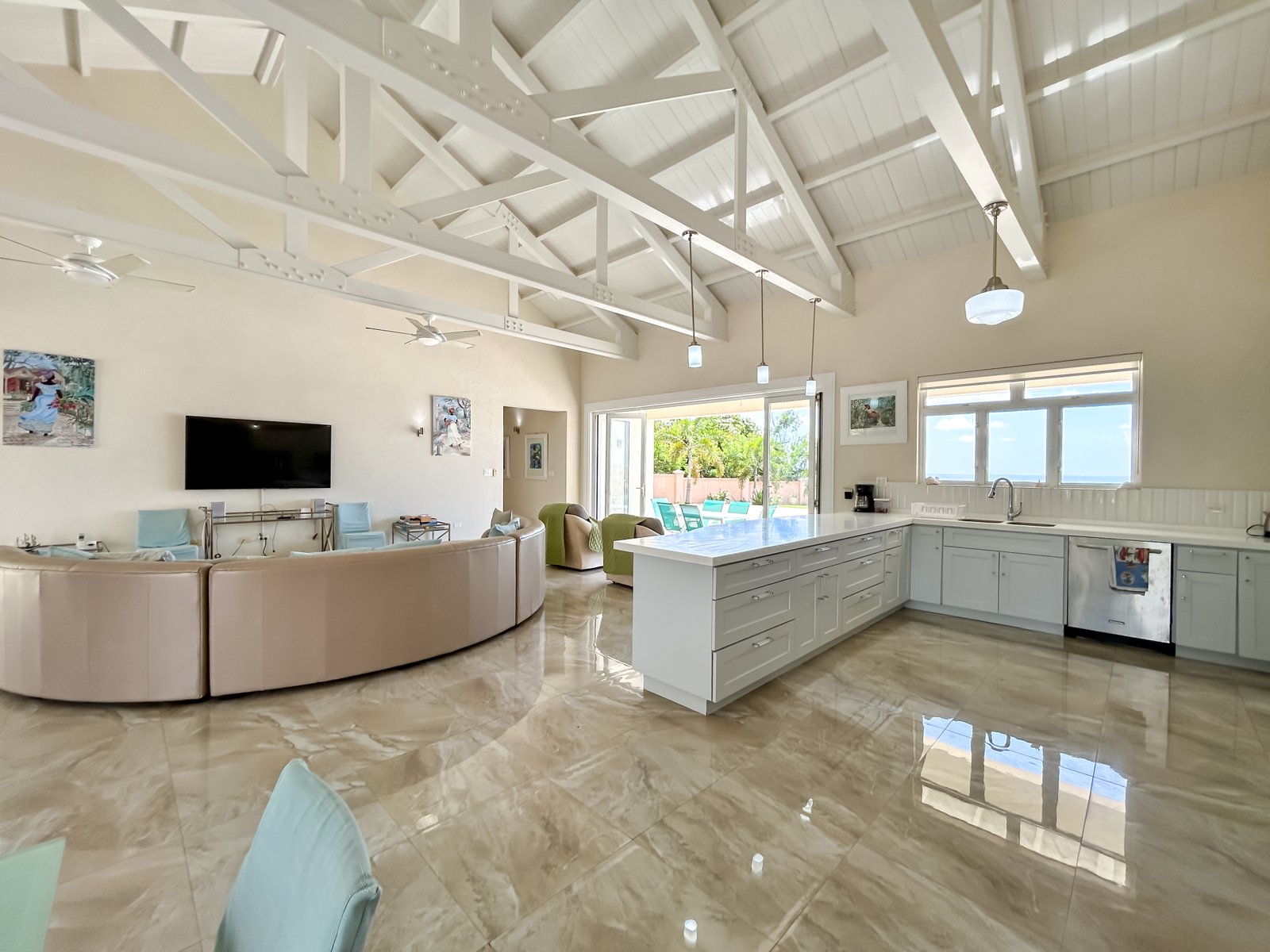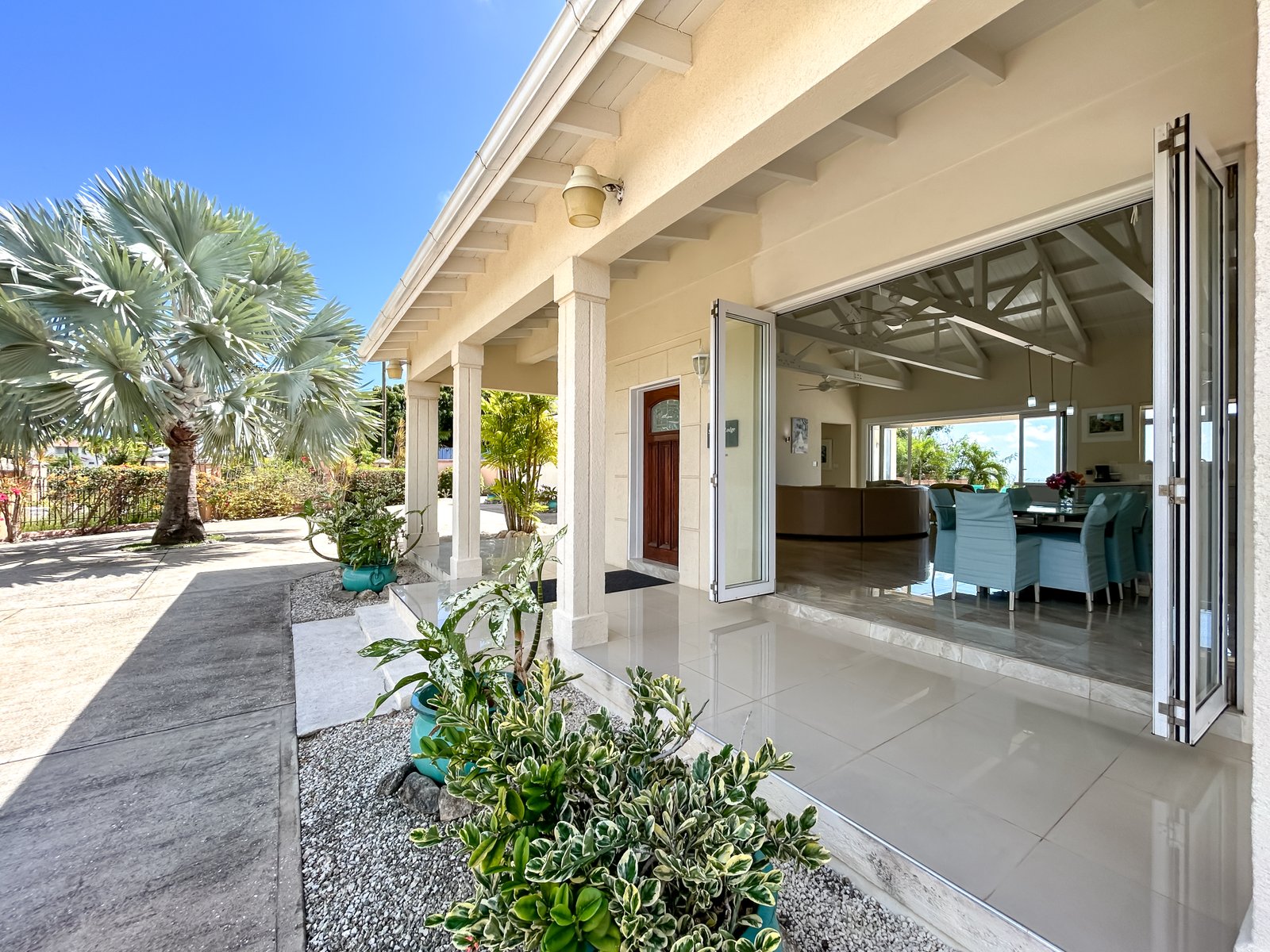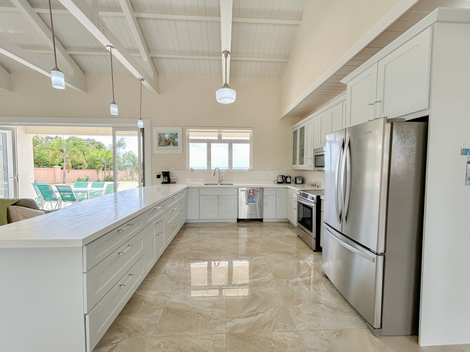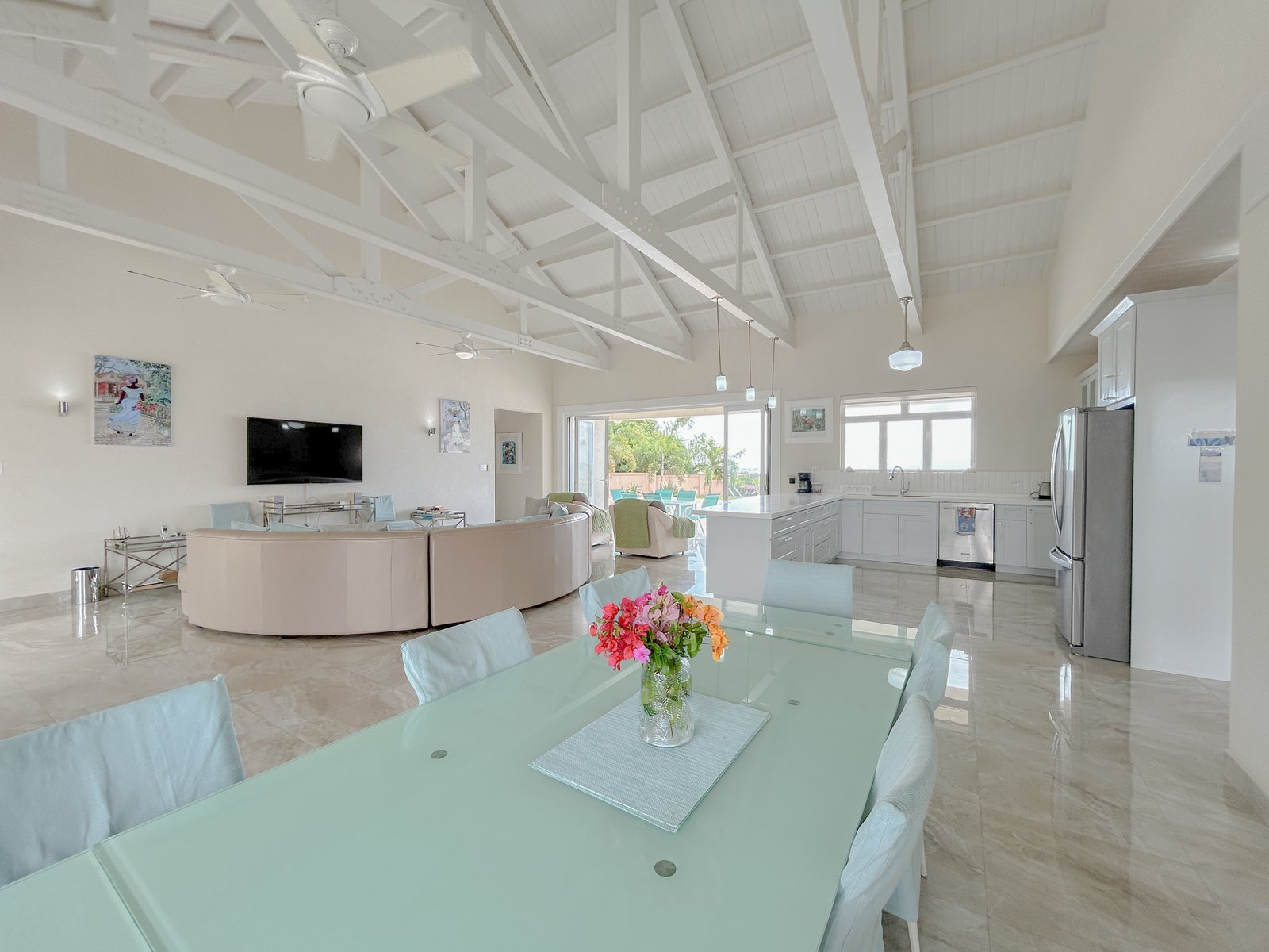 Set on a generous lot within a quiet residential neighbourhood, the villa is designed to capture natural light and refreshing island breezes. Inside, spacious living and dining areas flow seamlessly into a fully equipped gourmet kitchen, ideal for entertaining. High vaulted ceilings enhance the open place.