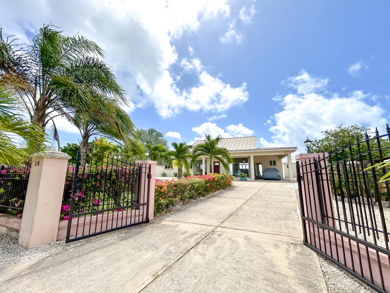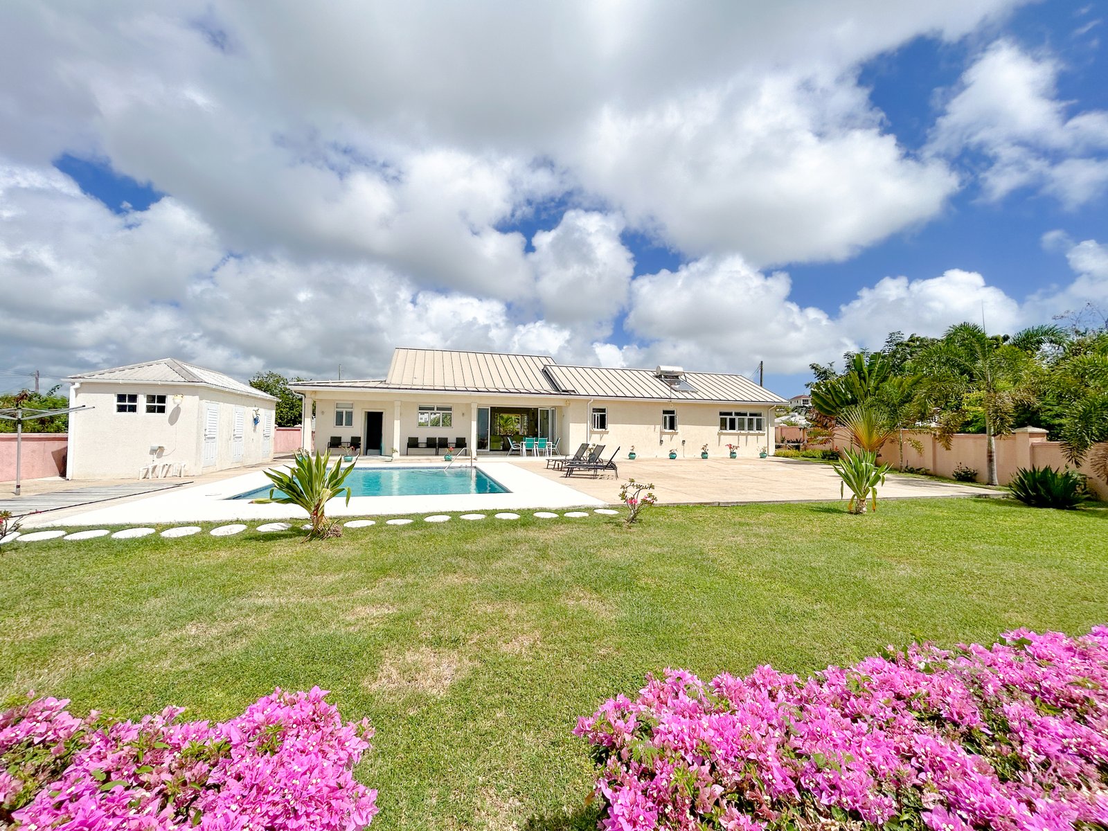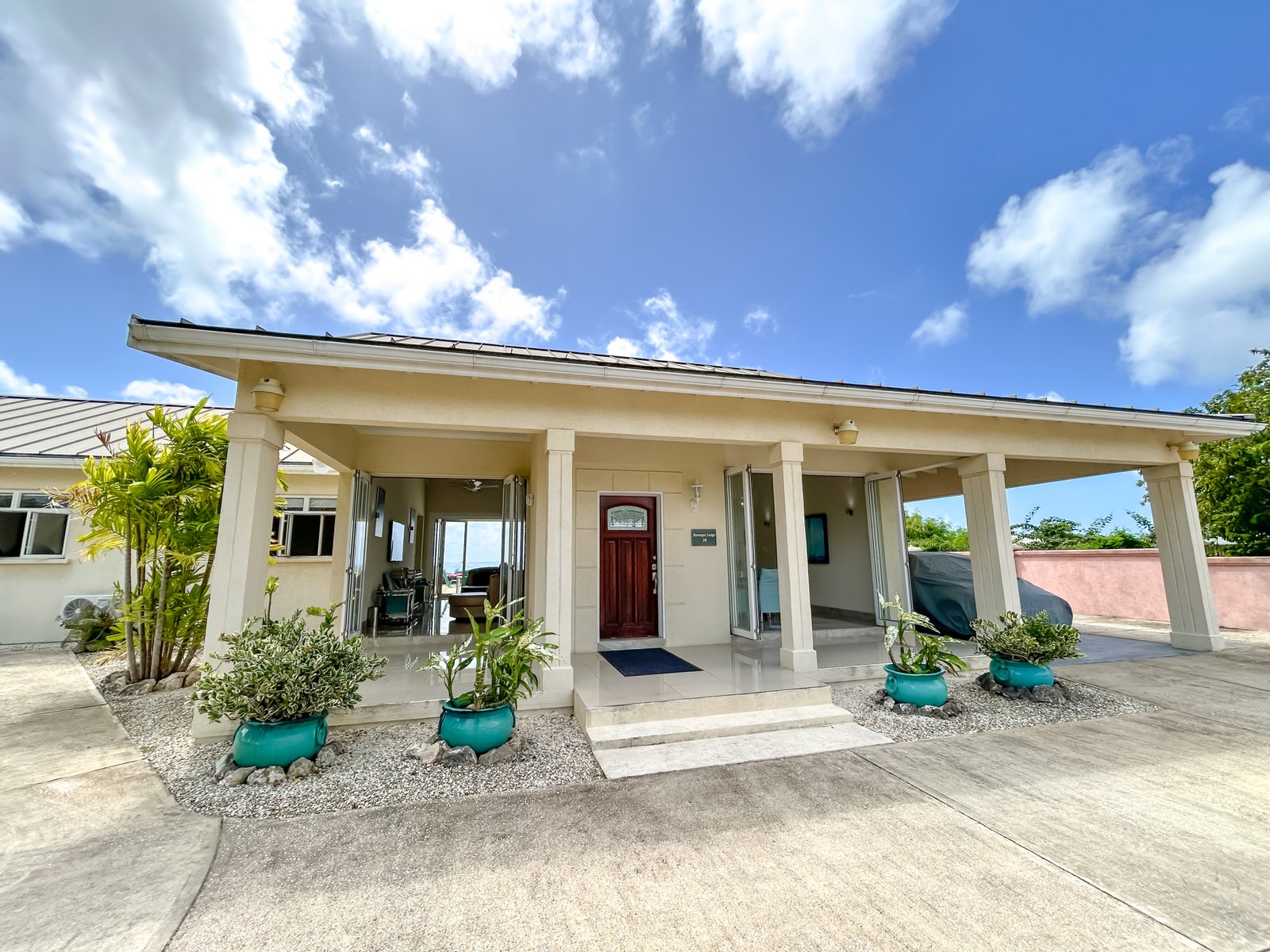 Set on a generous lot within a quiet residential neighbourhood, the villa is designed to capture natural light and refreshing island breezes. Inside, spacious living and dining areas flow seamlessly into a fully equipped gourmet kitchen, ideal for entertaining. High vaulted ceilings enhance the open place.