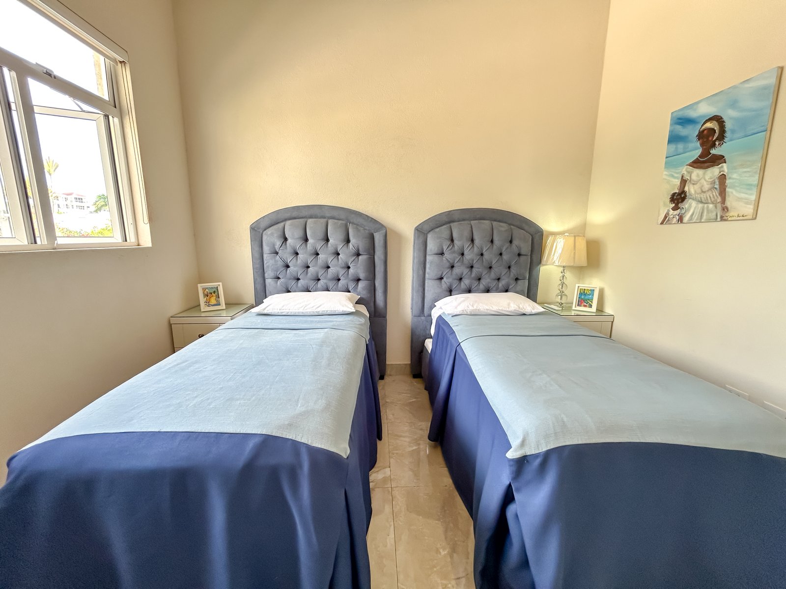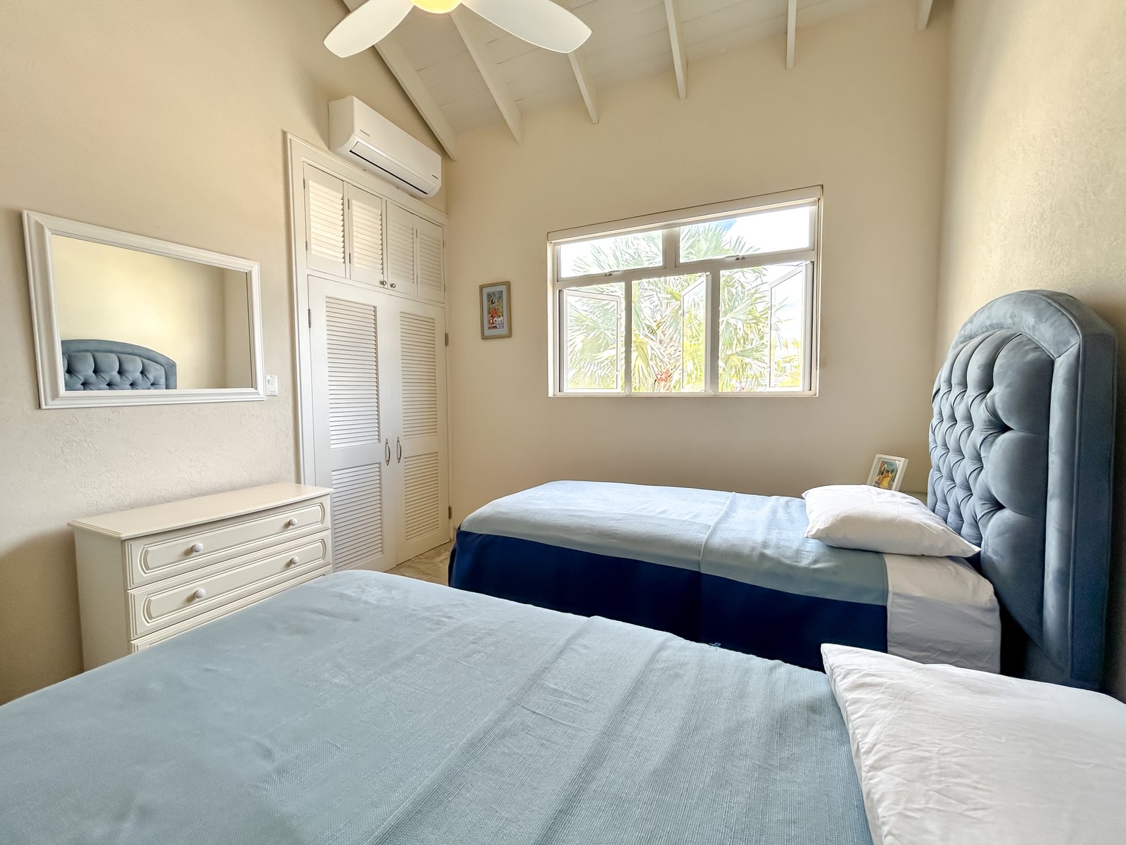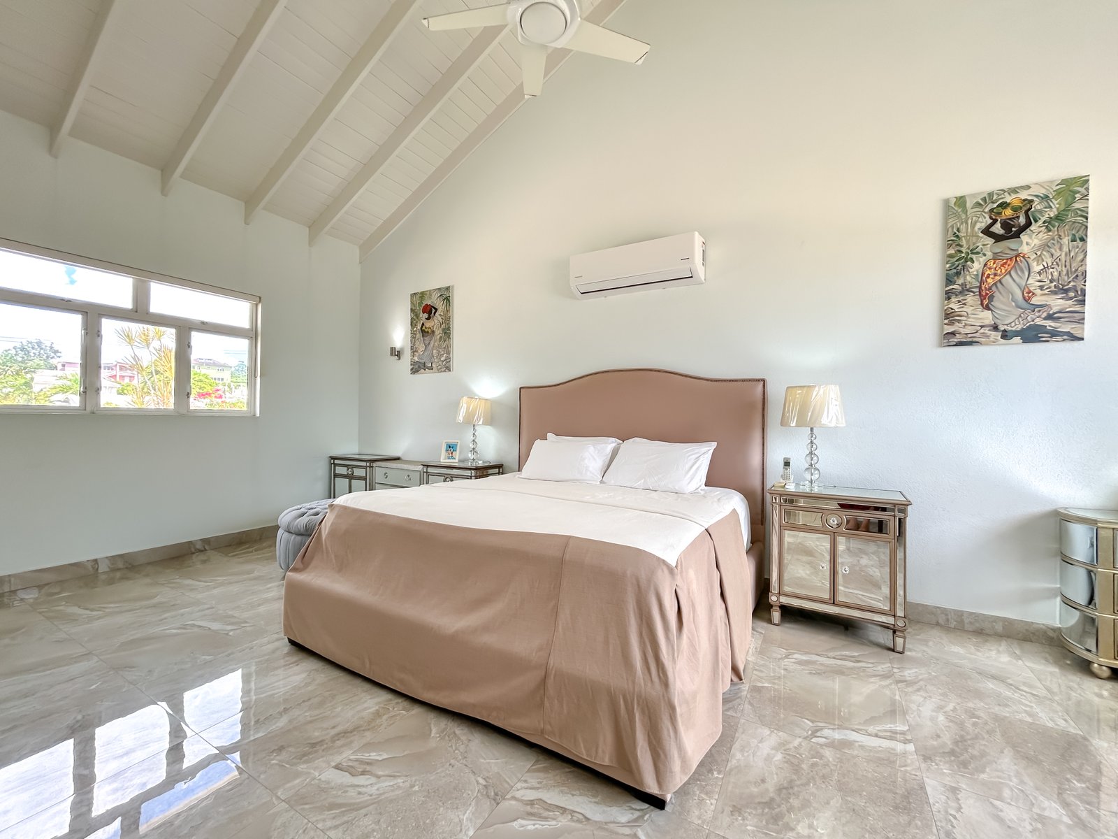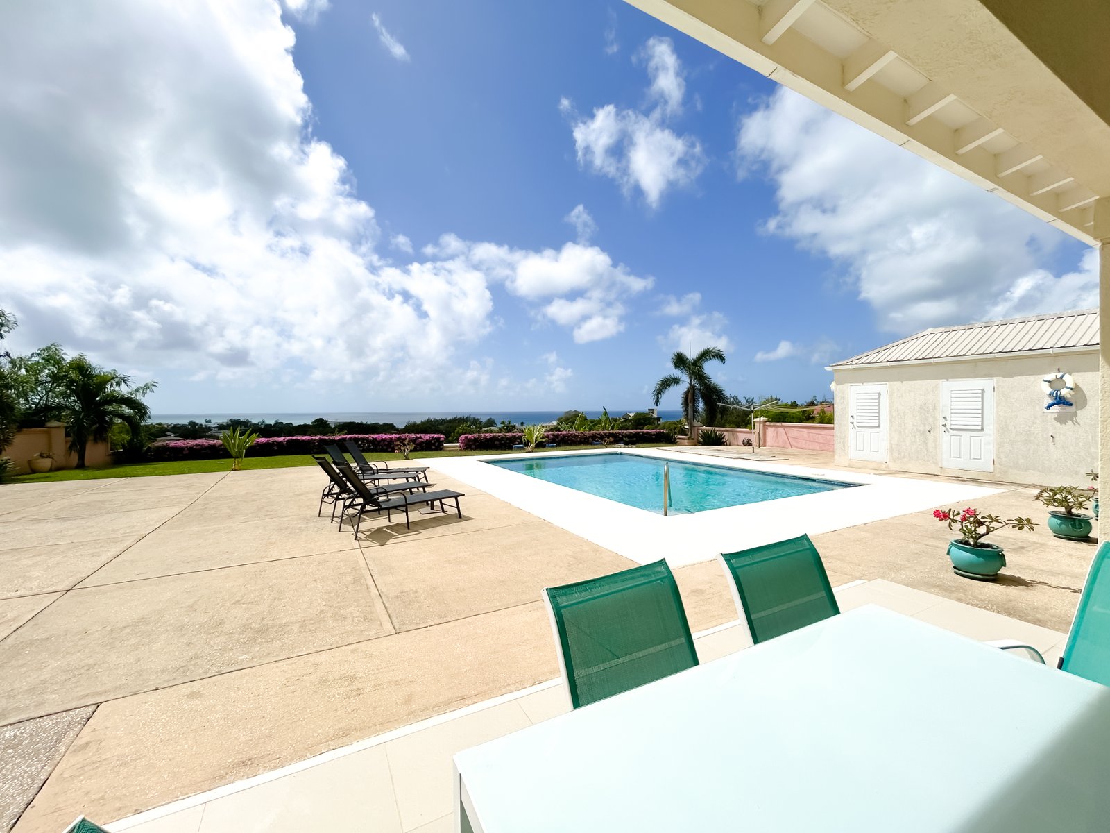 Set on a generous lot within a quiet residential neighbourhood, the villa is designed to capture natural light and refreshing island breezes. Inside, spacious living and dining areas flow seamlessly into a fully equipped gourmet kitchen, ideal for entertaining. High vaulted ceilings enhance the open place.