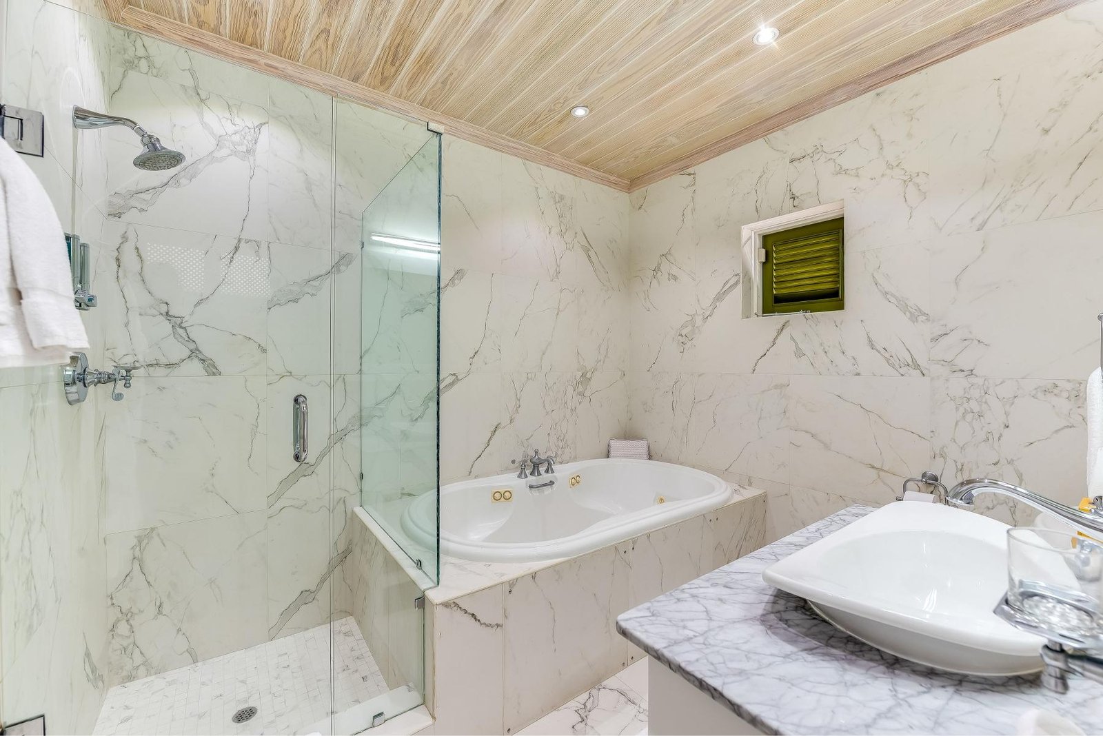 Upstairs, three additional en-suite bedrooms offer privacy and comfort. Two overlook the pool area and enjoy the warmth of the afternoon sun, while the third benefits from cool north easterly breezes. The primary suite includes a spacious bathroom with a jacuzzi tub and a separate shower, creating a serene retreat.