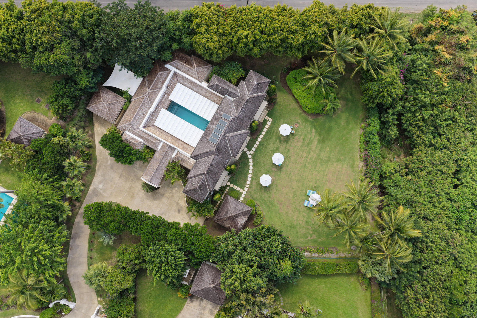 The property boasts a magnificent, unique feature – a palatial indoor, open-air pool with a retractable overhead canopy providing maximum shade and privacy. The spacious pool deck is perfect for entertaining and flows seamlessly into the main living area and sophisticated bar.