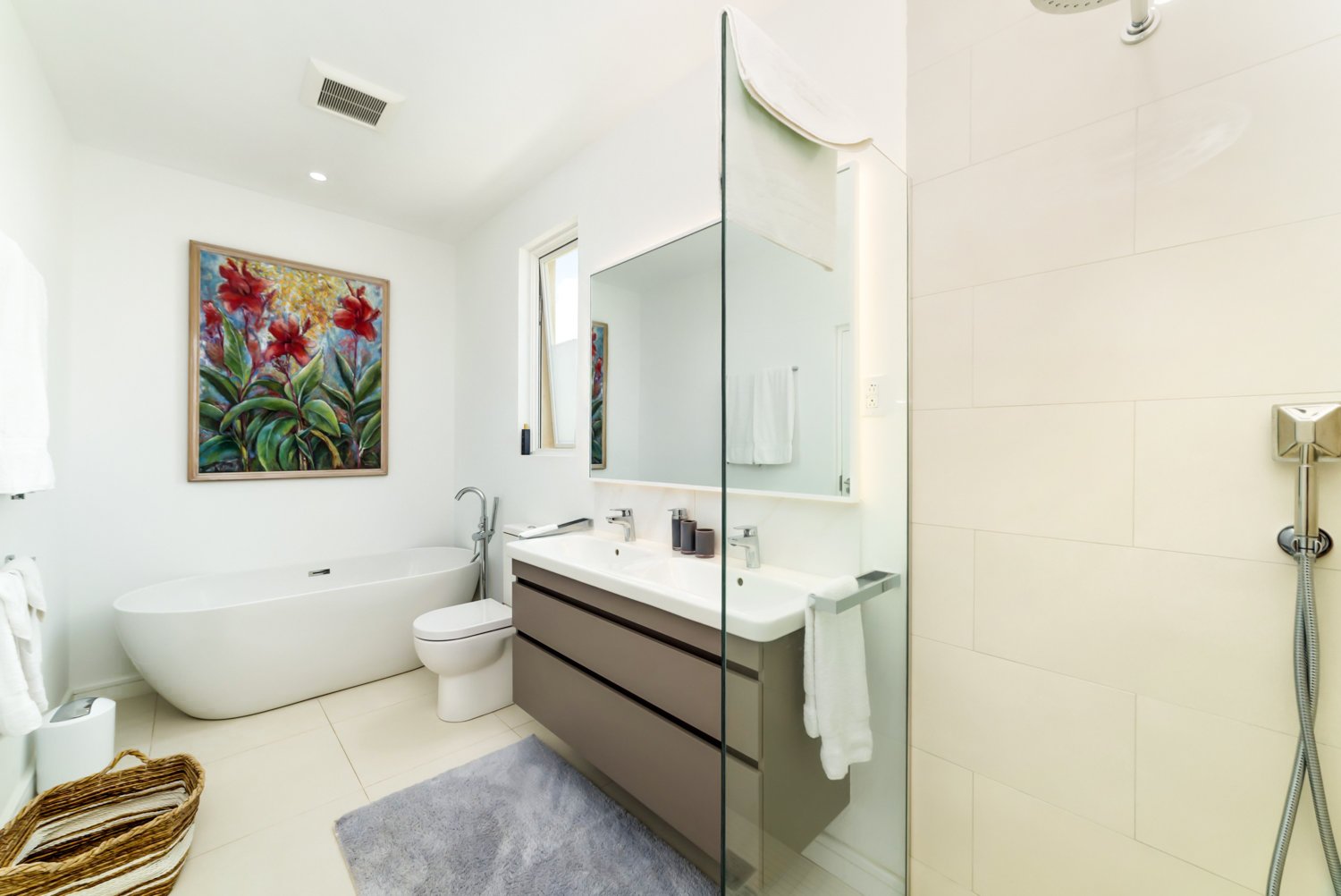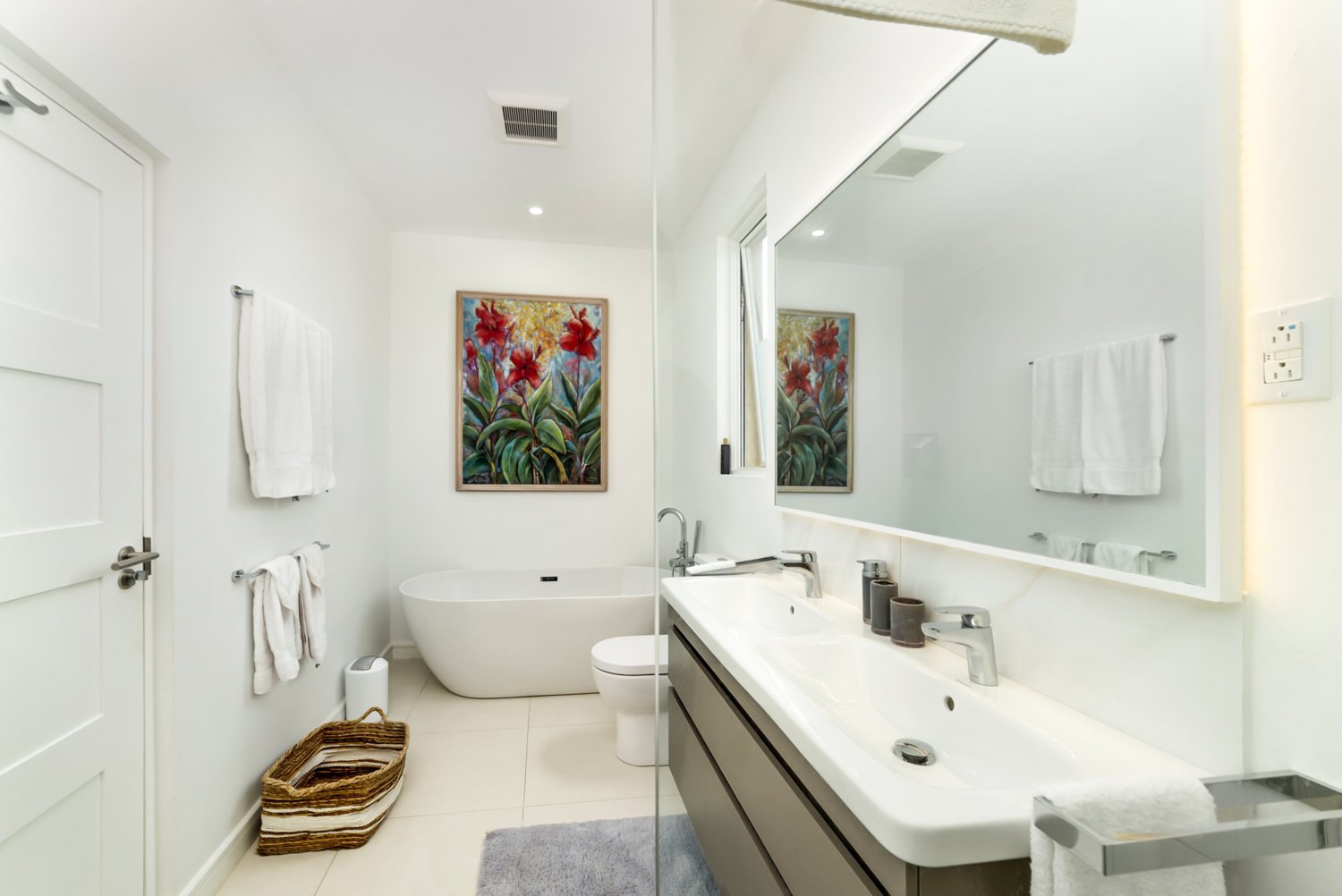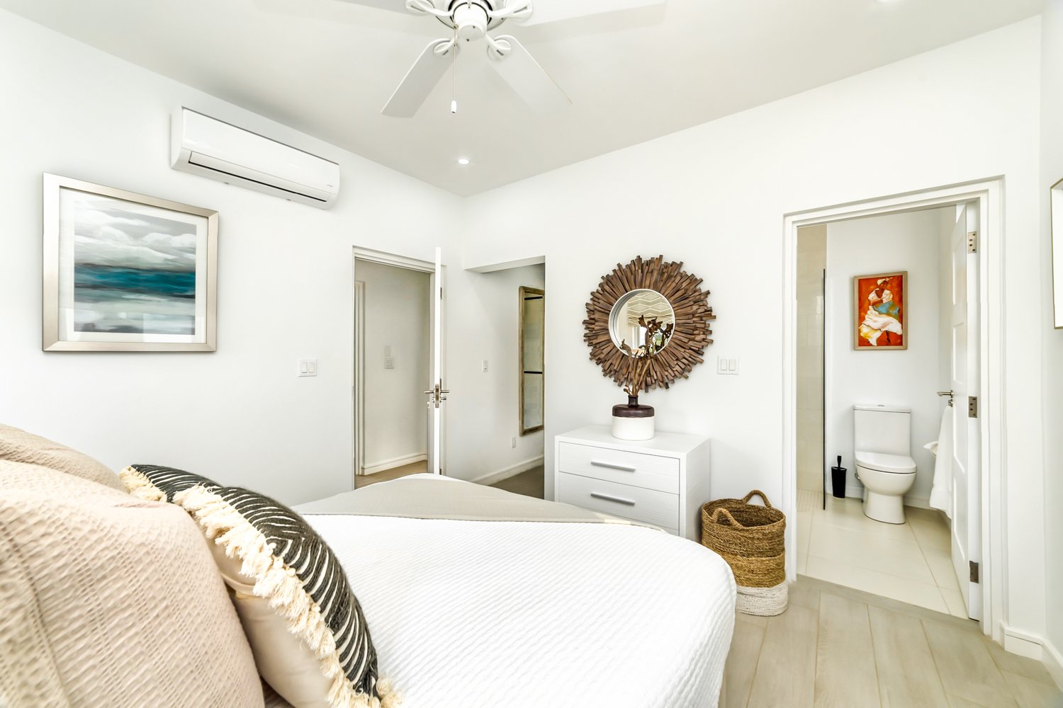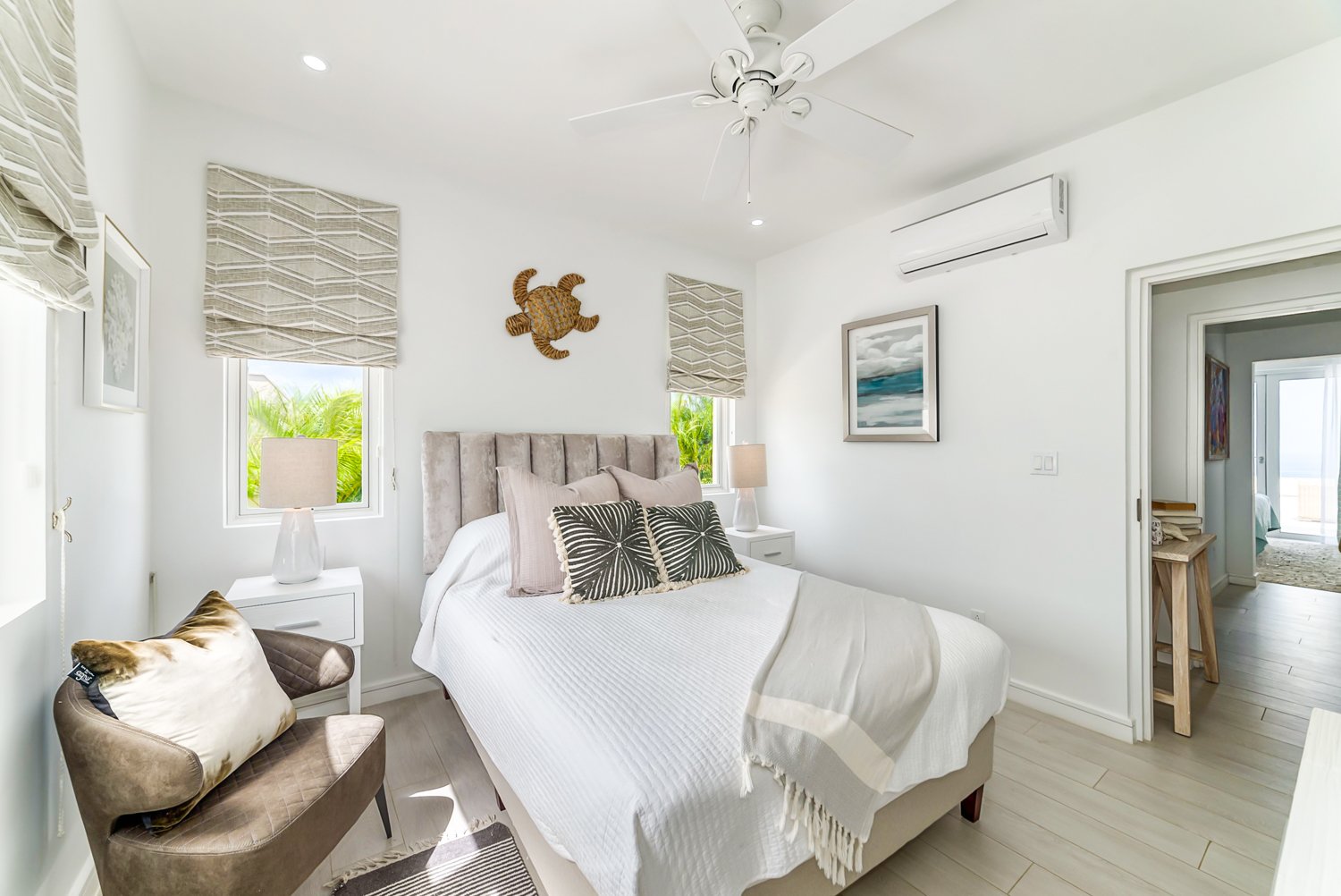 The villa features four generously sized, air-conditioned bedrooms, with three conveniently located on the main open-plan living level alongside three modern bathrooms. The fourth ensuite bedroom is elegantly styled as a charming external cottage on the floor below, ensuring both comfort and privacy for residents and guests alike.