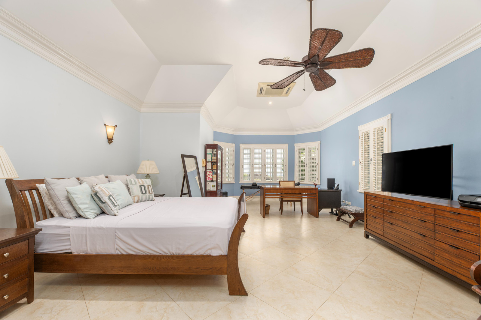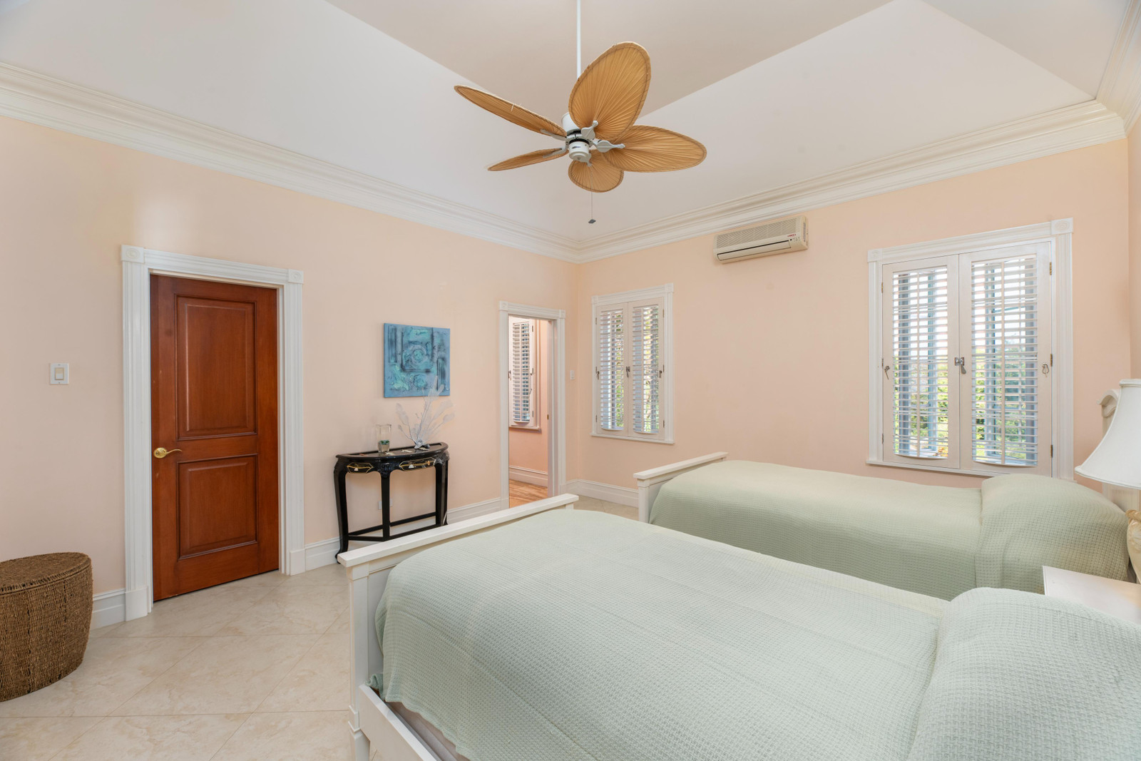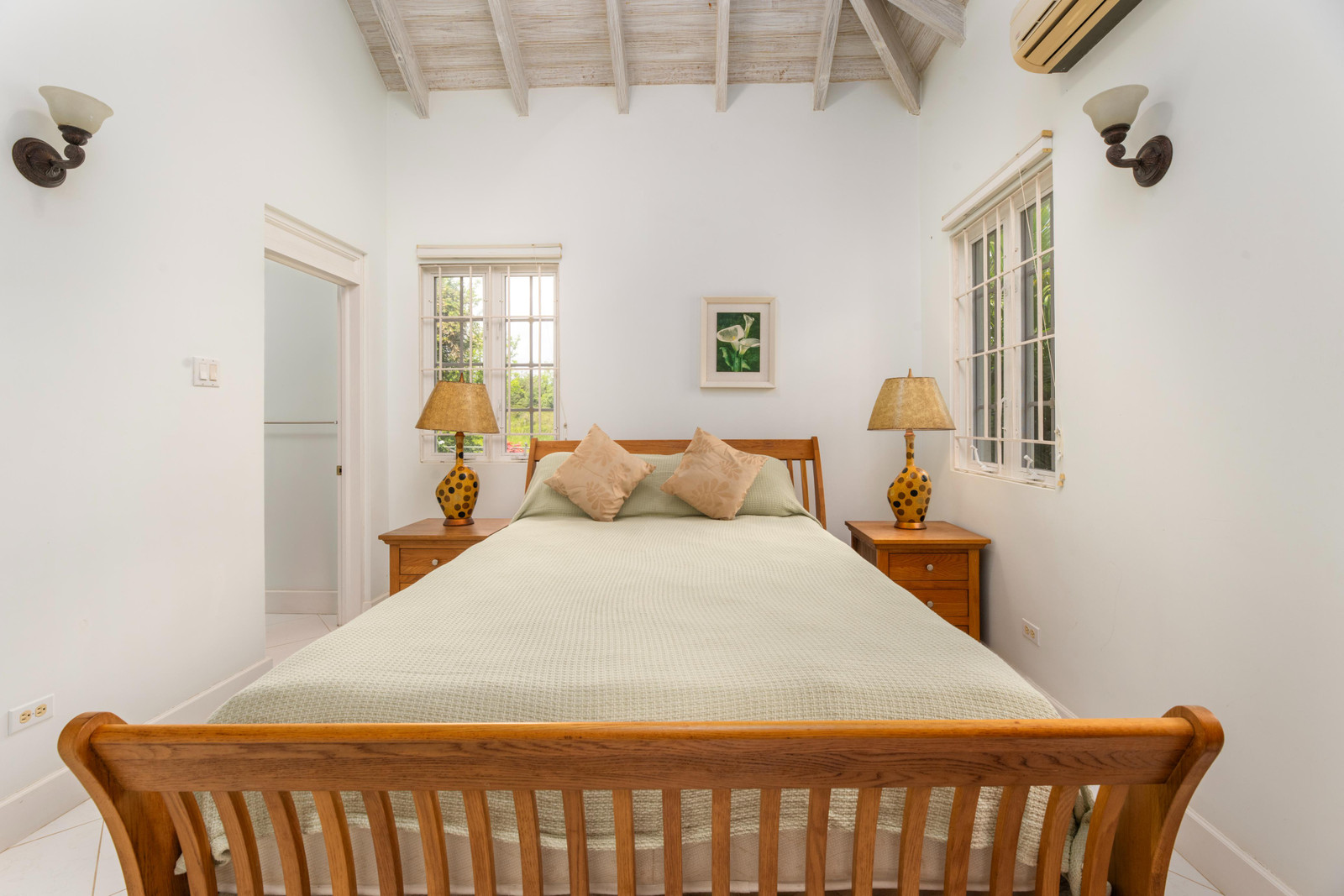 The bright, airy and air-conditioned kitchen features a new double oven and a walk-in pantry and opens onto a breezy outdoor dining and lounge area, offering a seamless transition for everyday living and entertaining. The main house comprises three well-appointed bedrooms, three full bathrooms, and two powder rooms. All bedrooms are equipped with air conditioning for comfort. The northern wing is dedicated entirely to the master suite, providing a luxurious and private retreat. This space includes a king-size bed and a generous walk-in closet. The en-suite bathroom boasts a double vanity and a large shower. The two guest bedrooms include one with a king-size bed and the other with two twin beds. Both have en-suite bathrooms and ample closet space.