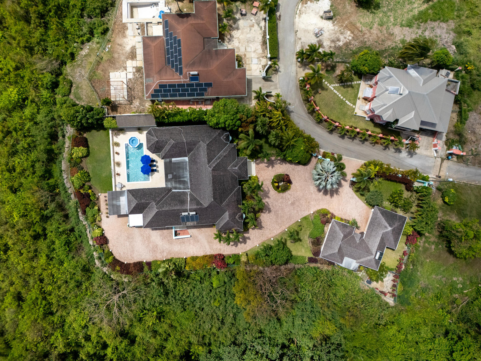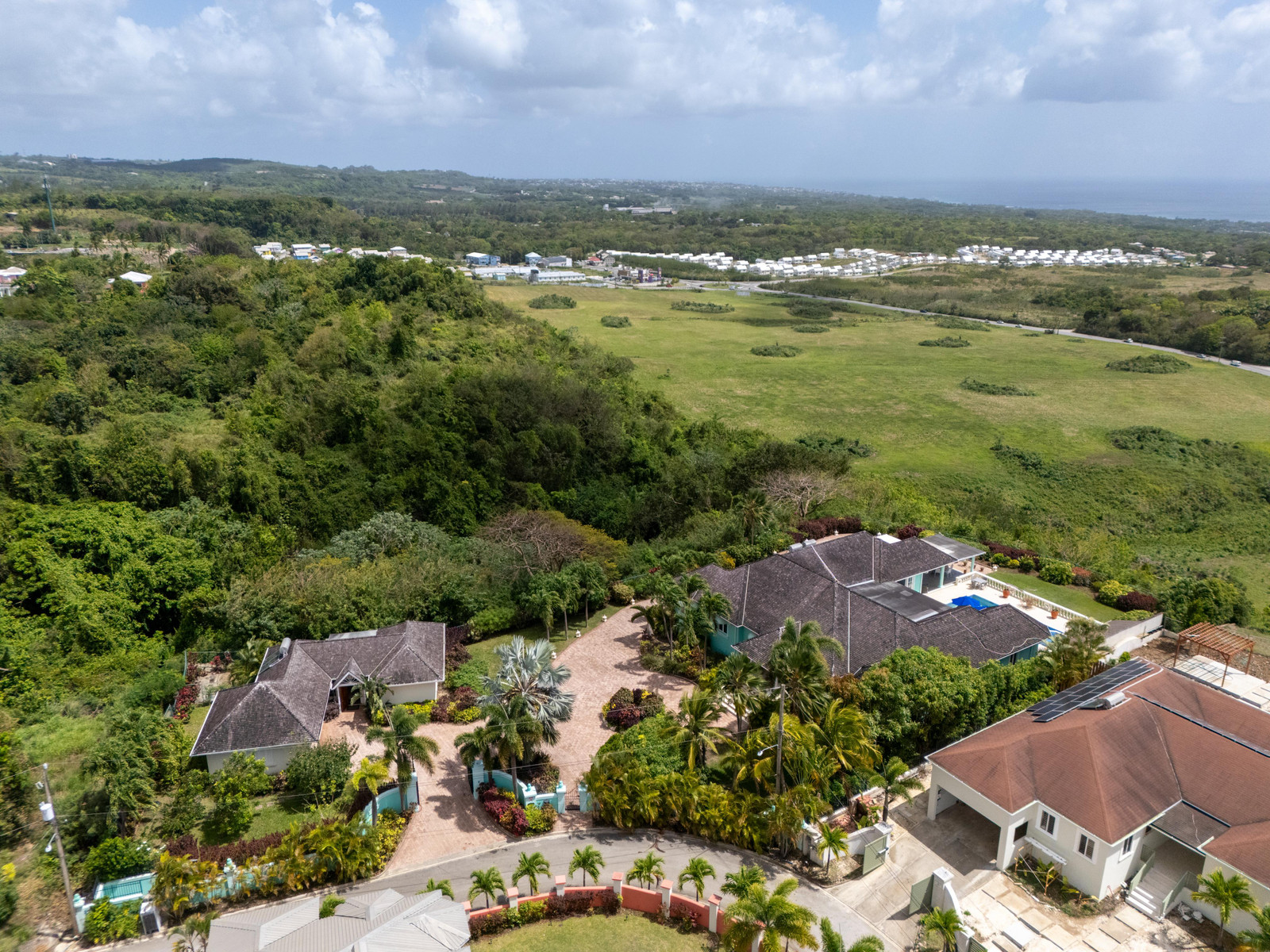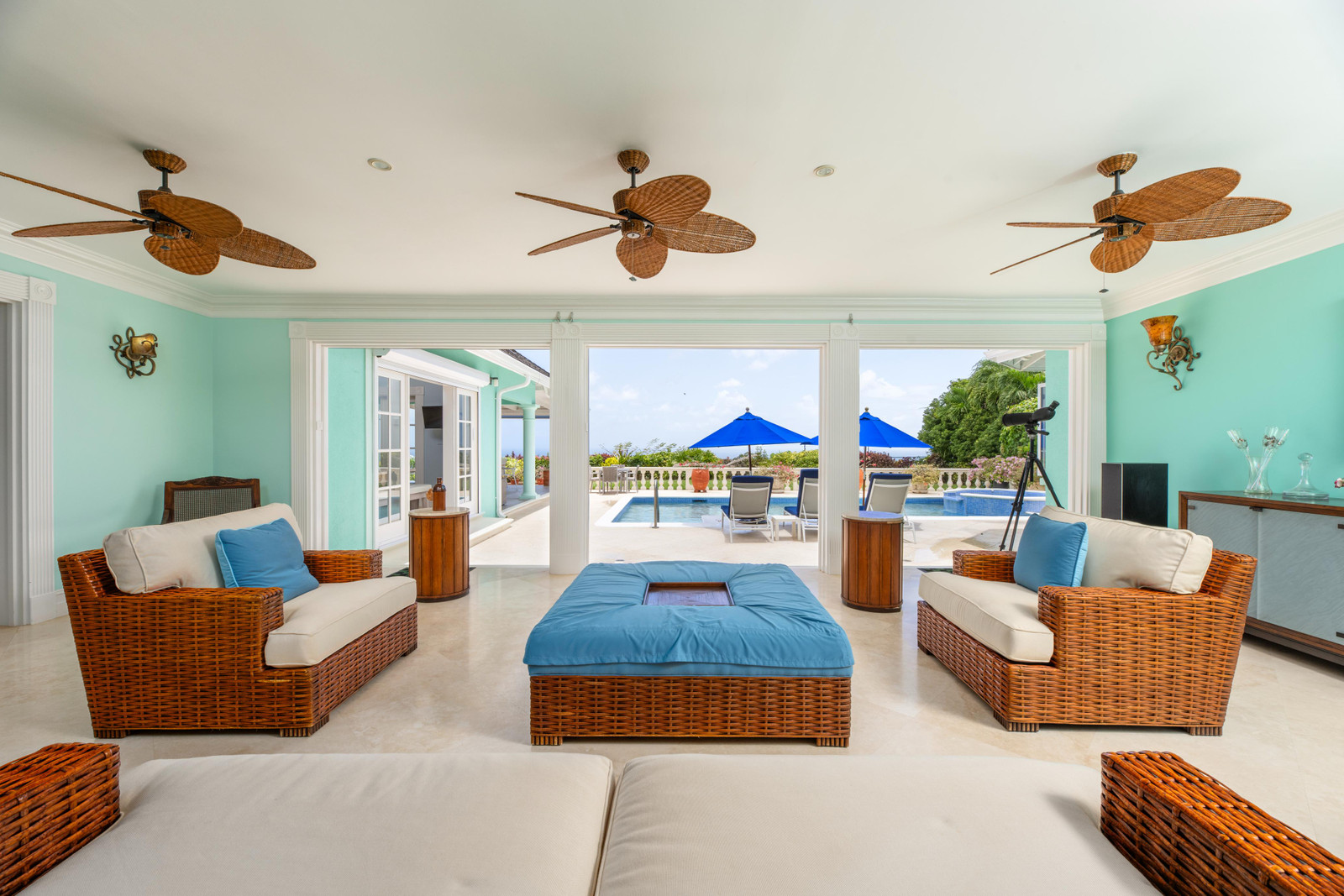 The bright, airy and air-conditioned kitchen features a new double oven and a walk-in pantry and opens onto a breezy outdoor dining and lounge area, offering a seamless transition for everyday living and entertaining. The main house comprises three well-appointed bedrooms, three full bathrooms, and two powder rooms. All bedrooms are equipped with air conditioning for comfort. The northern wing is dedicated entirely to the master suite, providing a luxurious and private retreat. This space includes a king-size bed and a generous walk-in closet. The en-suite bathroom boasts a double vanity and a large shower. The two guest bedrooms include one with a king-size bed and the other with two twin beds. Both have en-suite bathrooms and ample closet space.